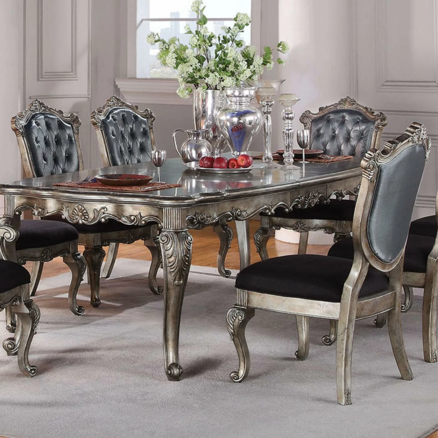 The Queen Anne style Acme Furniture Chantelle Dining Side Chairs – Set of 2 will see you and your family dining like royalty. This exquisite pair is crafted from solid wood in an antique silver finish complemented by silk-like fabric at the seat and back. Each chair flaunts carved cabriole front legs, flared back legs, and an elegantly sculpted crown. Silver fabric adorns each side of the backrest, but shows off the added embellishment of button tufted accents on its interior while the plump seat is covered in the blackest material weβve ever witnessed. Some assembly is required.