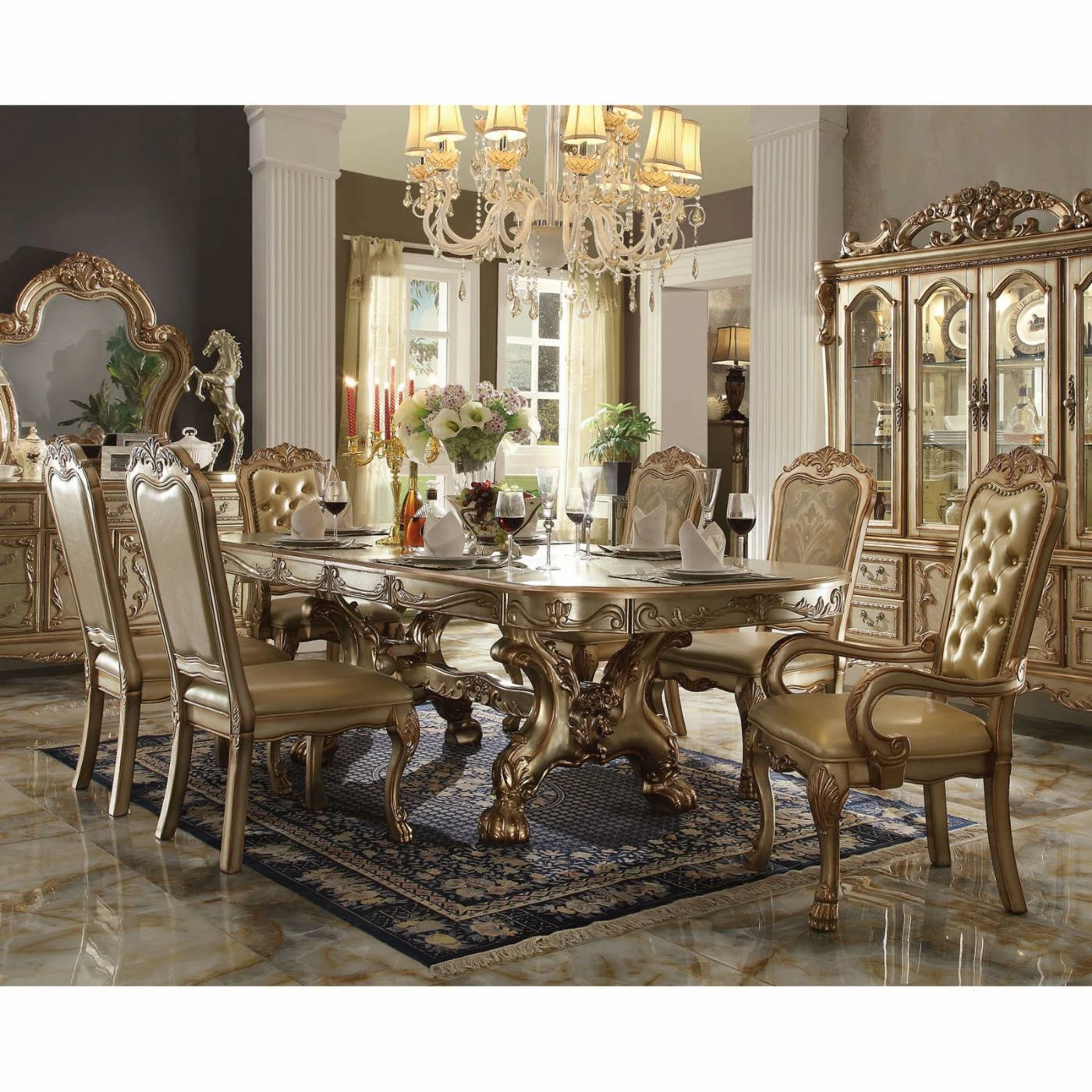 The Acme Furniture Dresden Dining Side Chairs – Set of 2 – Gold Patina adds an understated charm to your classical dining room design scheme. Two matching chairs come included in this set, both boasting curved, clawed front feet and subtle carved details all over the frame. Durable wood solids are used to construct the piece, finished in a handsome gold patina color. The seats and backs come padded thickly with foam and are then upholstered in a bone-colored faux leather.