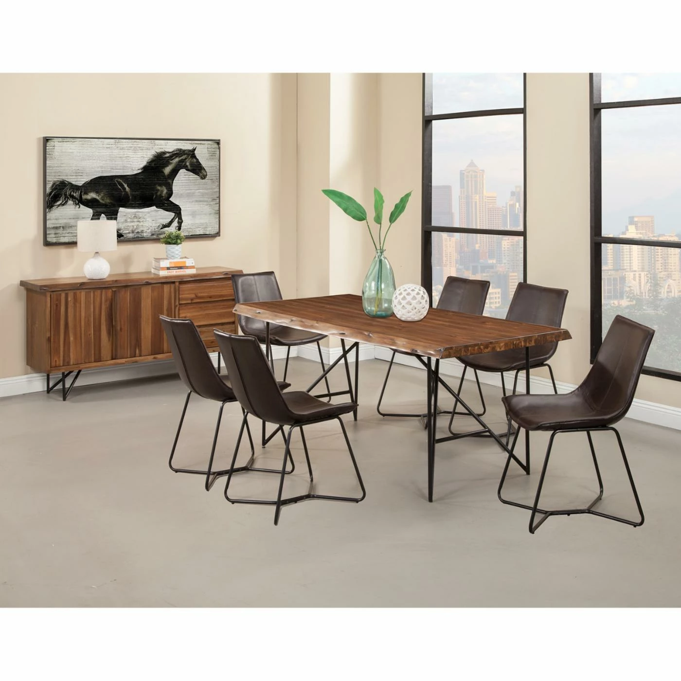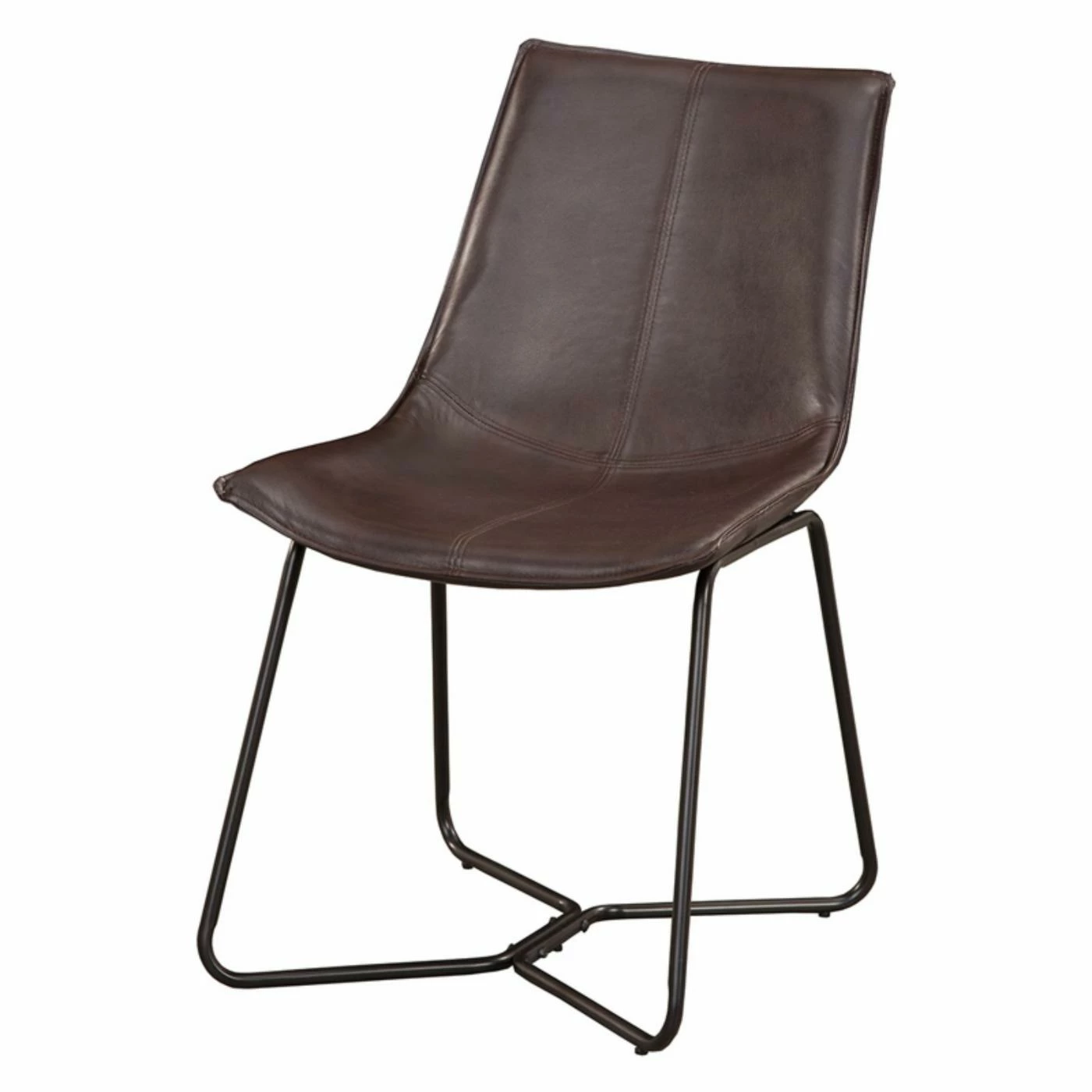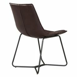 The luxe look of leather meets a streamlined silhouette with the Alpine Furniture Live Edge Bonded Leather Side Chairs – Set of 2. With a modern sensibility, these side chairs feature slender metal legs in a black finish. The curved seat is upholstered in dark brown bonded leather, complete with decorative stitching for visual interest.
