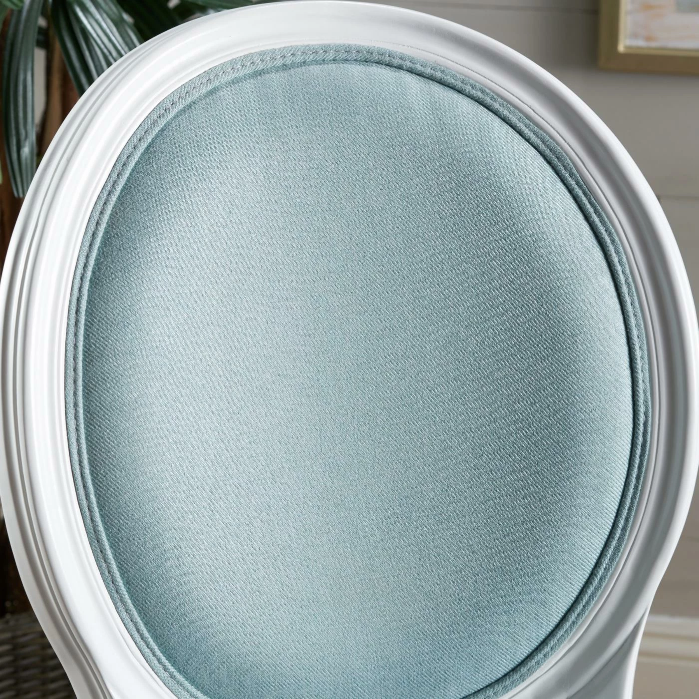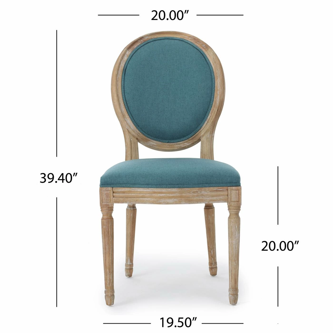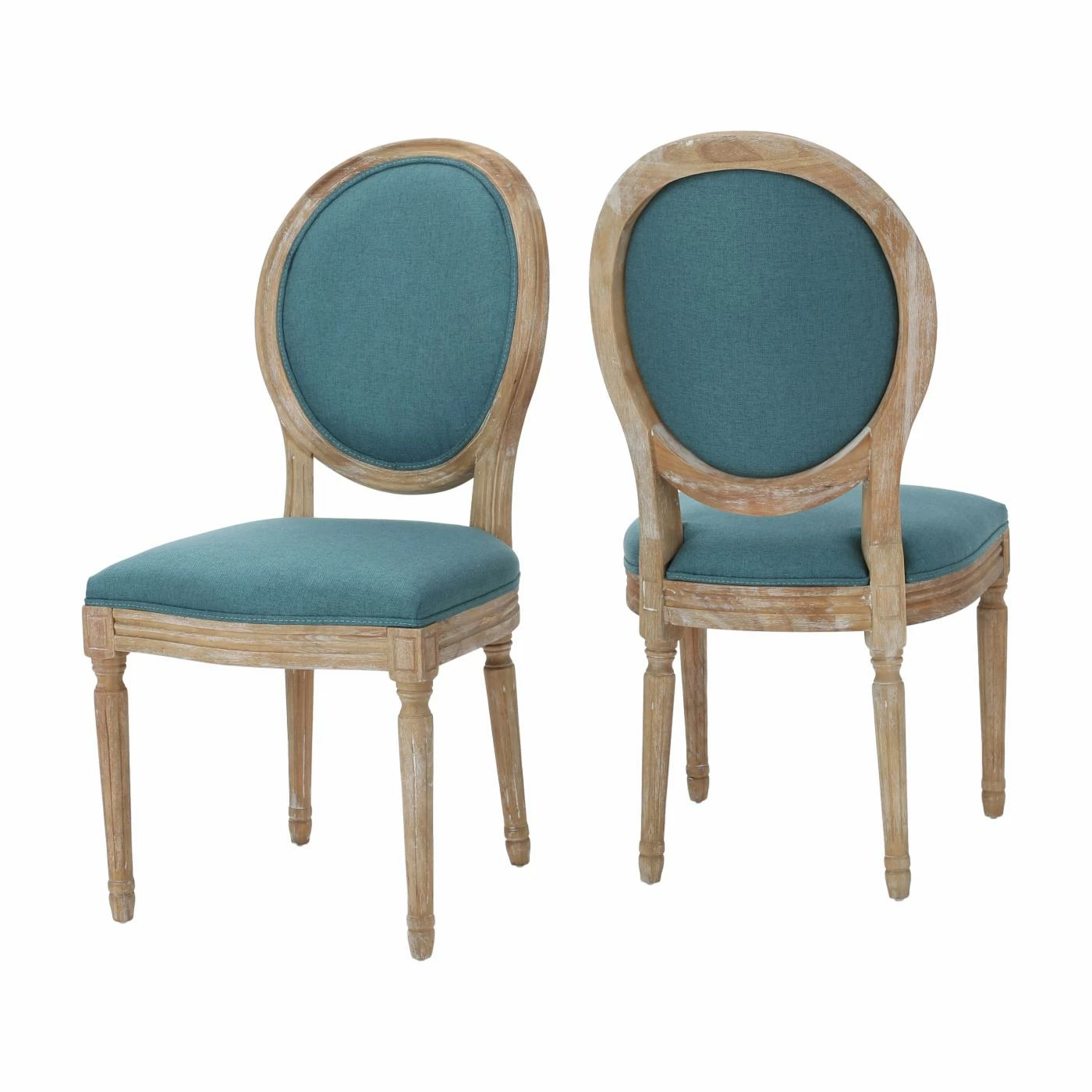Decorate your dining room in elegant old-world style with the Phinnaeus Oval Back Dining Side Chair – Set of 2. Intricate carvings and a washed distressed finish give the solid rubberwood frames of the dining chairs the visual appeal of authentic antiques. Foam padding and crisp polyester fabric cover the round backs and deep seats for added comfort.