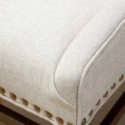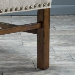 Dining may be in the name, but the Caden Fabric Parsons Dining Chair – Set of 2 has the style and comfort to benefit any room from entryway or living room to even your home office. Each chair is expertly crafted from solid hardwood with front block legs and flared back legs connected by stretchers for unshakeable stability. The sturdy foundation of each chair can support up to 300 pounds and serves as a handsome complement to the light beige polyester upholstery covering the cushioned seat, back, and sloped arms. For a finishing touch, a border of bronze studs decorates the line between wood and fabric. No assembly is required.