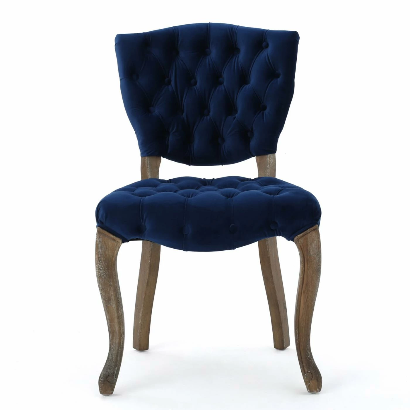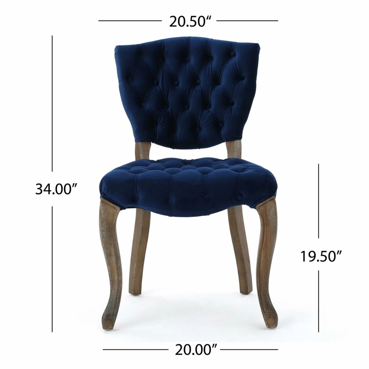 Bring a dose of European sophistication to your space with the Bates Tufted Navy Blue New Velvet Dining Chairs – Set of 2. Luxurious padding and an elegant tufted design lend visual allure to this velvety set. Its sturdy oak frame ensures you’ll get years of enjoyment out of this attractive set.