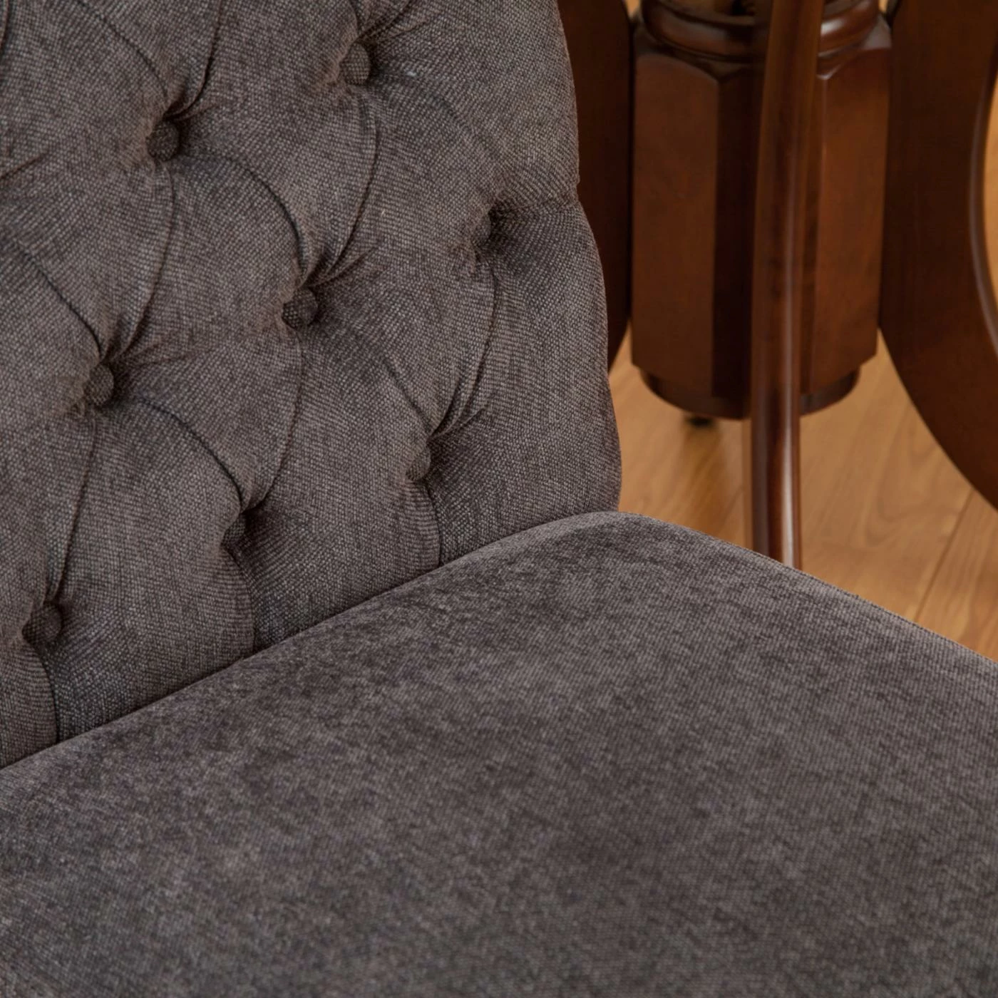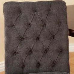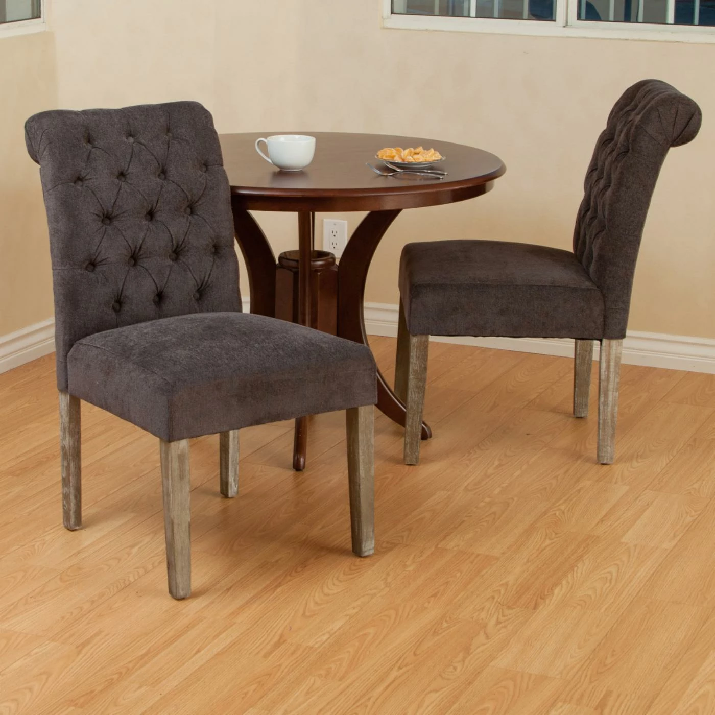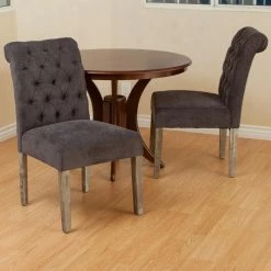 Guaranteed to impress, the luxurious Park Dining Chair – Set of 2 makes a statement whether it’s at the table, in the living room, or in your office. The matching pair showcases an elegant design that begins with a rigid hardwood frame. The solid hardwood is exposed only at the tapered legs, which are lightly coated in a weathered finish for timeworn appeal. The seat and gracefully rolled backrest are cushioned and upholstered in dark gray linen fabric with button tufting in an attractive diamond pattern. These chairs will look wonderful in your formal dining room and can complement almost any style of dΓ©cor – from traditional to modern. Sold in sets of two. Some assembly is required.