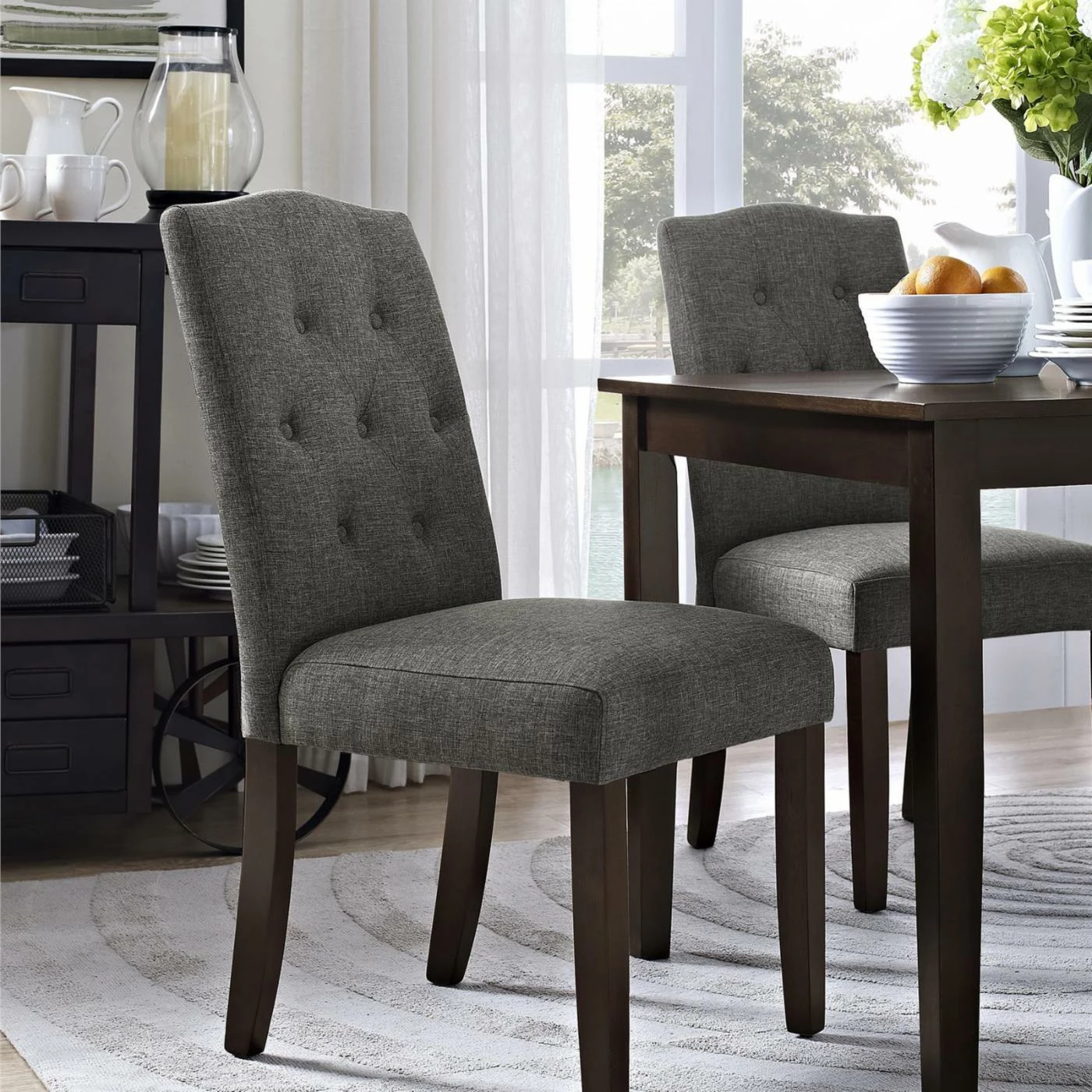 The Better Homes & Gardens Parsons Tufted Dining Side Chair gives your dining room a classic, buttoned-up look. This elegant dining chair has a solid wood frame thatβs enhanced by the faux linen upholstery, available in a selection of neutral colors. Decorative stitching and hand-sewn buttons decorate the back, while the padded seat uses high-density foam to provide maximum comfort.