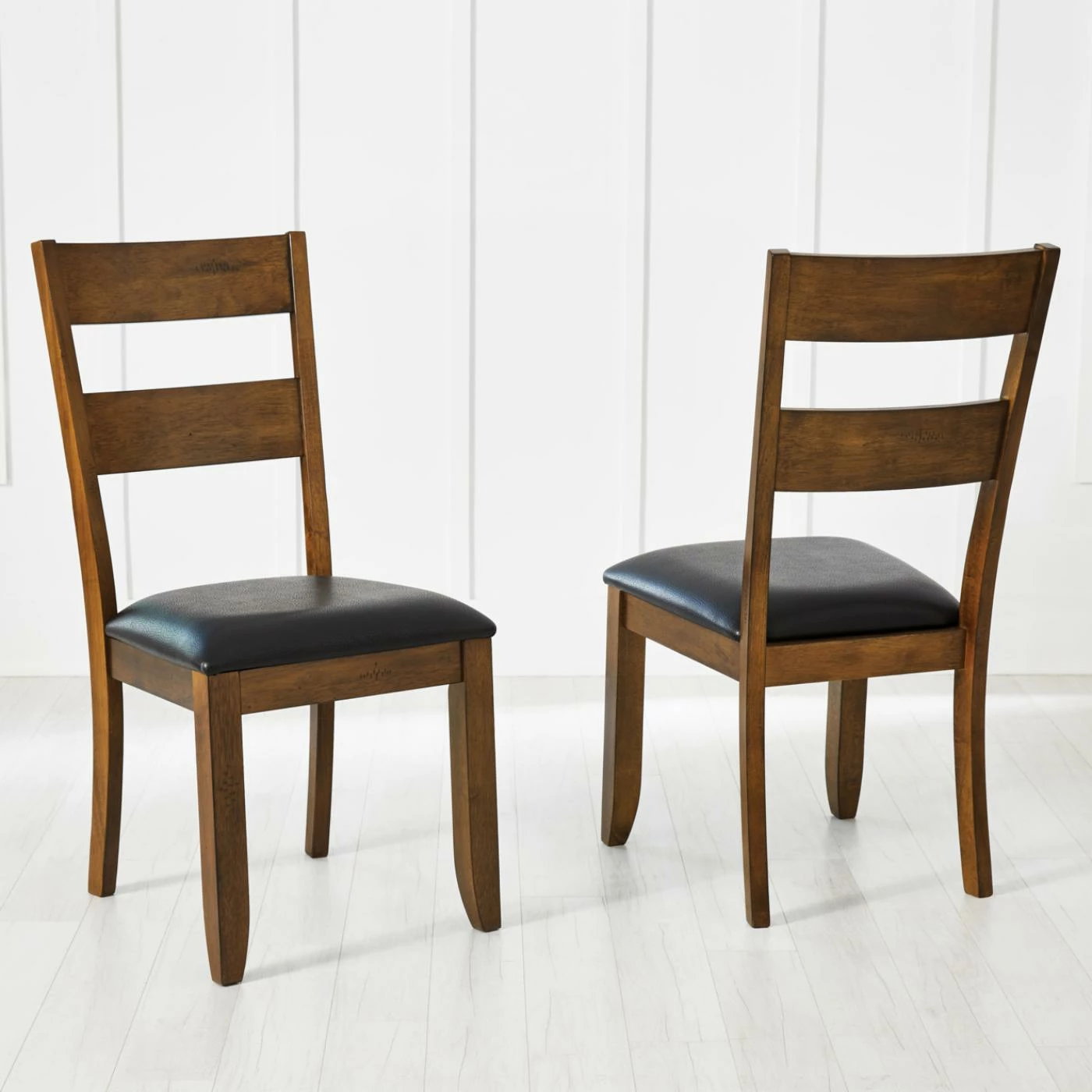 Rustic charm and maximum comfort, the A-America Mariposa Ladder Back Dining Side Chair – Rustic Whiskey – Set of 2 seats dinner guests in style. This set includes two side chairs with a classic ladder back design and black faux leather upholstered seats. They’re built of solid Asian hardwoods and have a heavily distressed Rustic Whiskey finish.