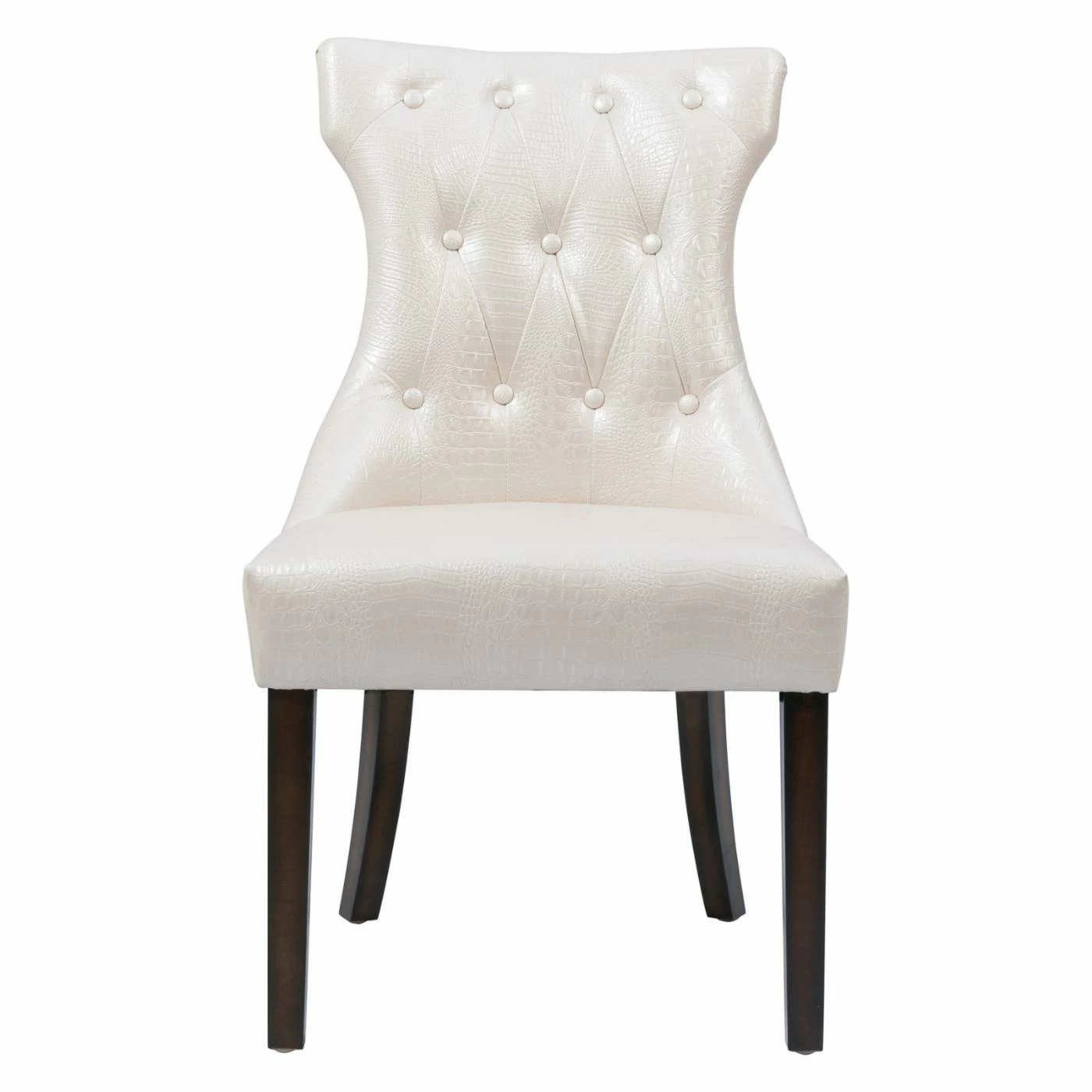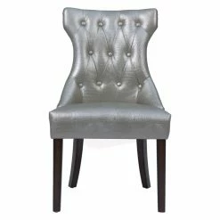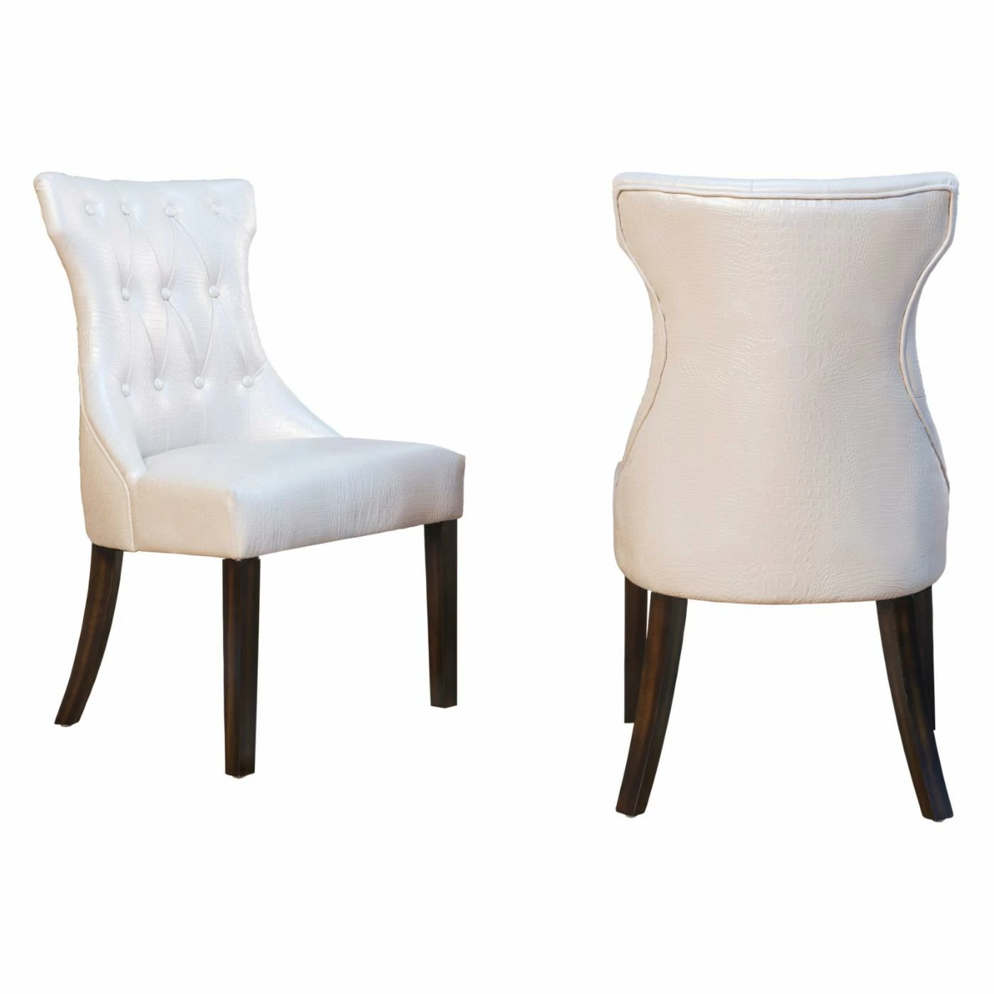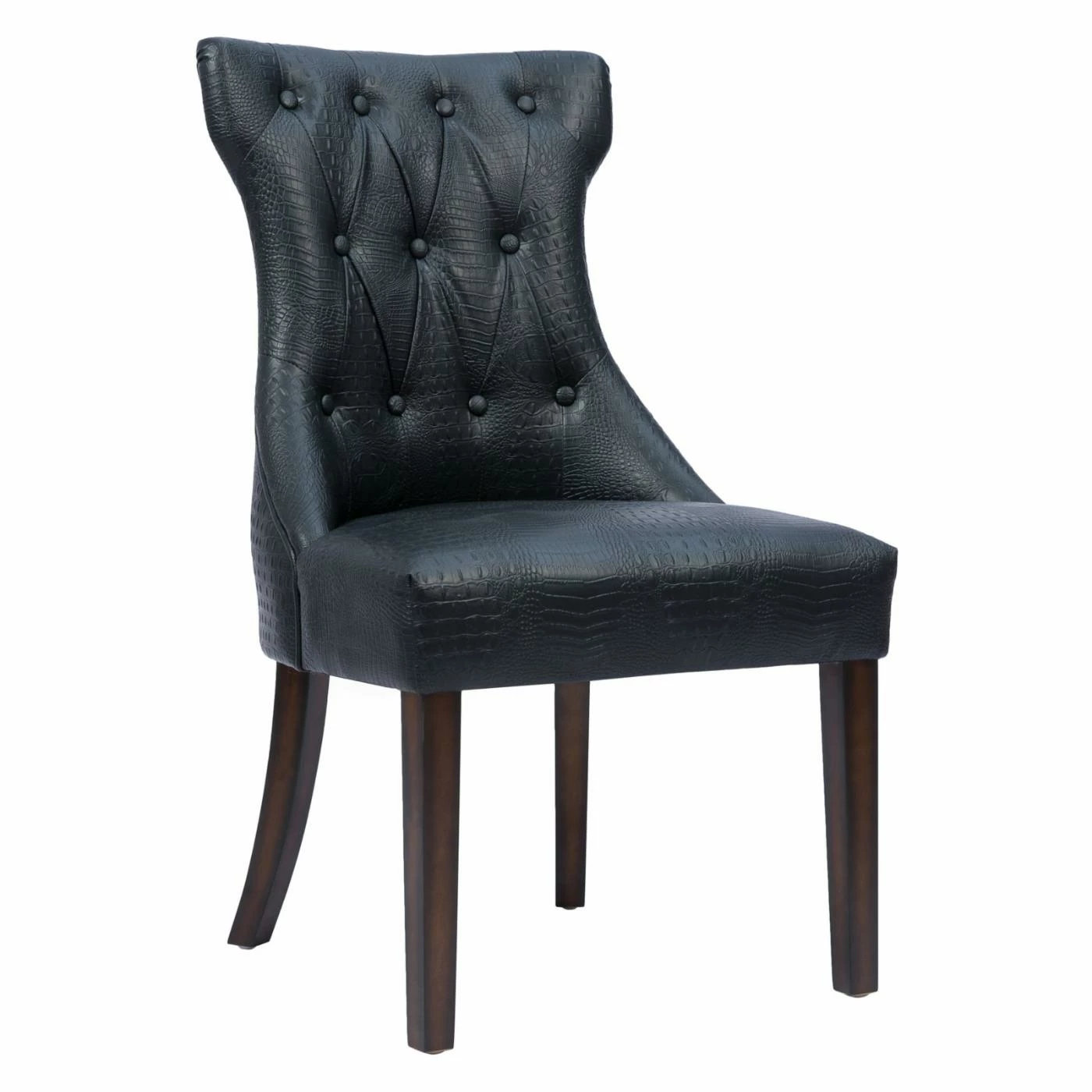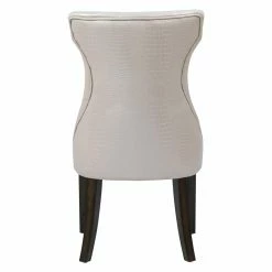 Mock croc embossed faux leather and a curvy T-shaped backrest give the Chic Home Bronte Tufted Dining Side Chair – Set of 2 its chic appeal. Smart button tufting and piping trim add a tailored feel to this dining side chair. A generous seat and flared wood legs offer comfort and stylish stability. The set includes two side chairs offered in your choice of available faux leather colors.