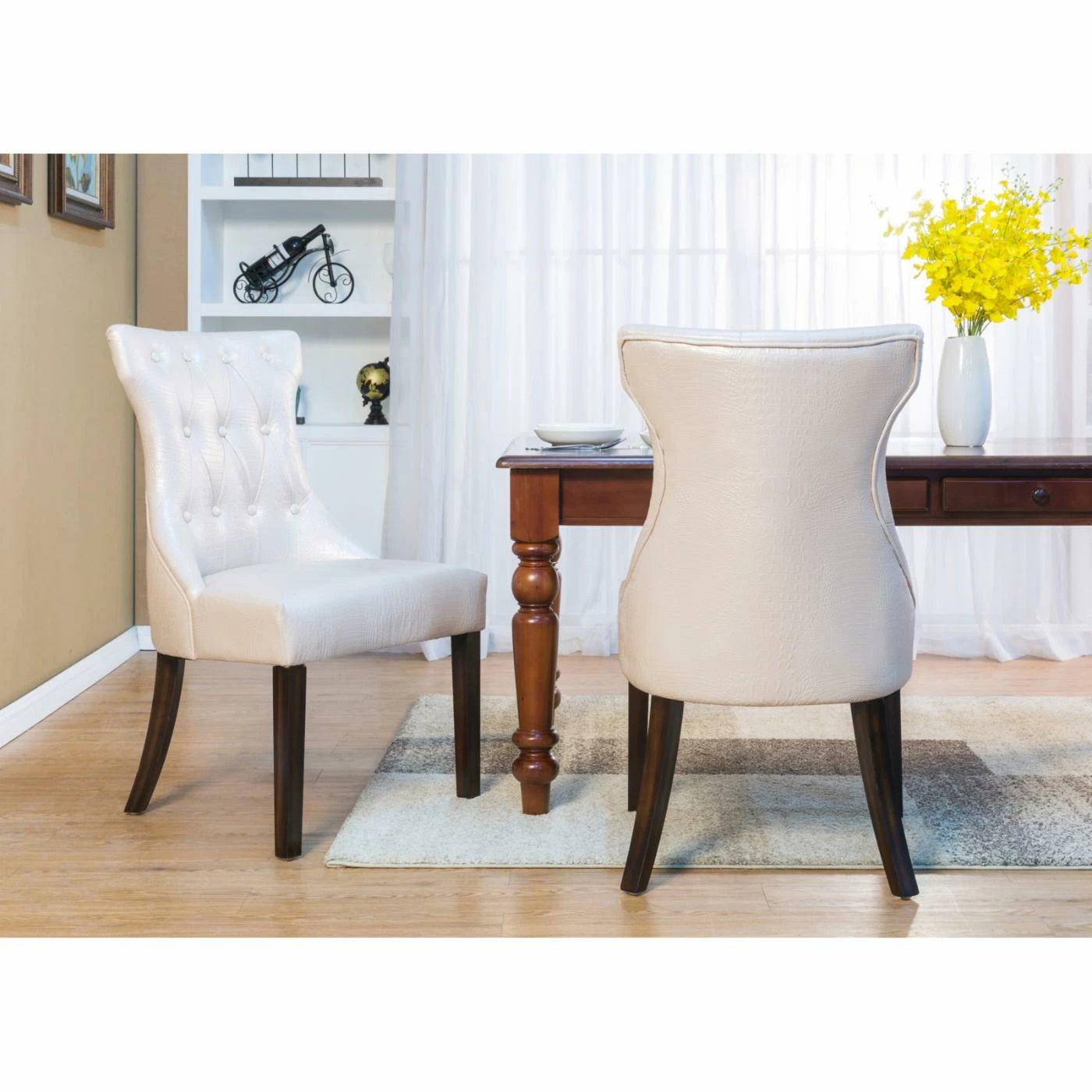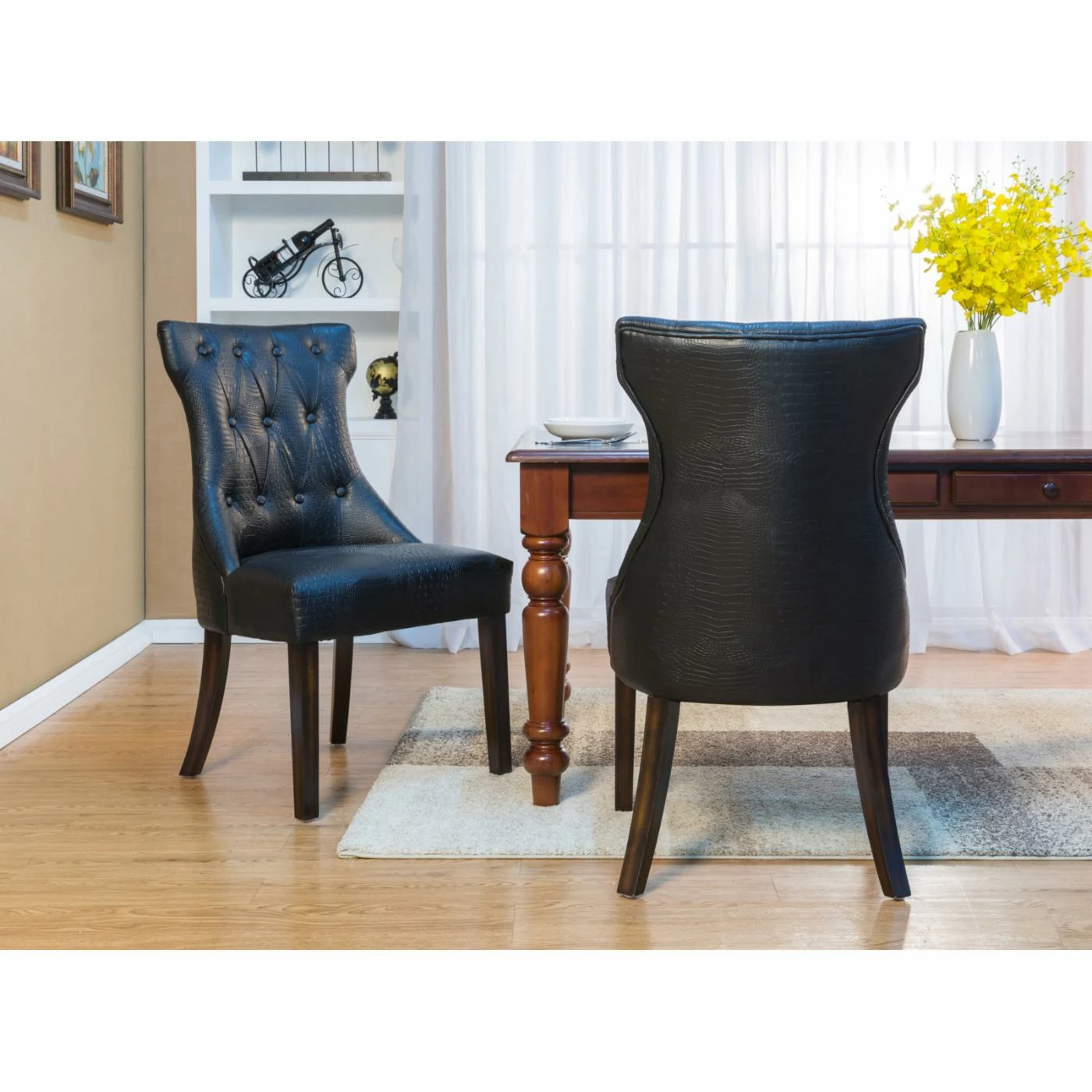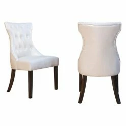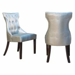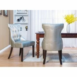 Mock croc embossed faux leather and a curvy T-shaped backrest give the Chic Home Bronte Tufted Dining Side Chair – Set of 2 its chic appeal. Smart button tufting and piping trim add a tailored feel to this dining side chair. A generous seat and flared wood legs offer comfort and stylish stability. The set includes two side chairs offered in your choice of available faux leather colors.
