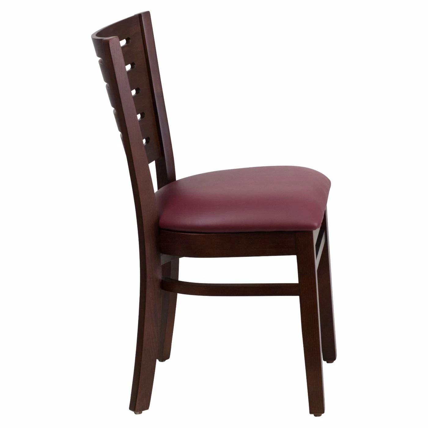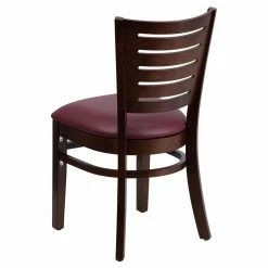 Rich dark wood gives the Flash Furniture Darby 20 in. Walnut Slat Back Restaurant Chair with Vinyl Seat an appealing warm look that will elevate any dining room. The finish is applied to a heavy-duty solid European beech hardwood frame, making this chair as durable as it is chic. To ensure lasting strength and sturdiness, the chair is crafted using mortise-and-tenon techniques and features metal wood screw reinforcements. Thick foam pads the seat for comfort, and vinyl upholstery adds the look of leather while keeping maintenance to a minimum. Completing the design are plastic glides, which help the chair move without scratching your floors.