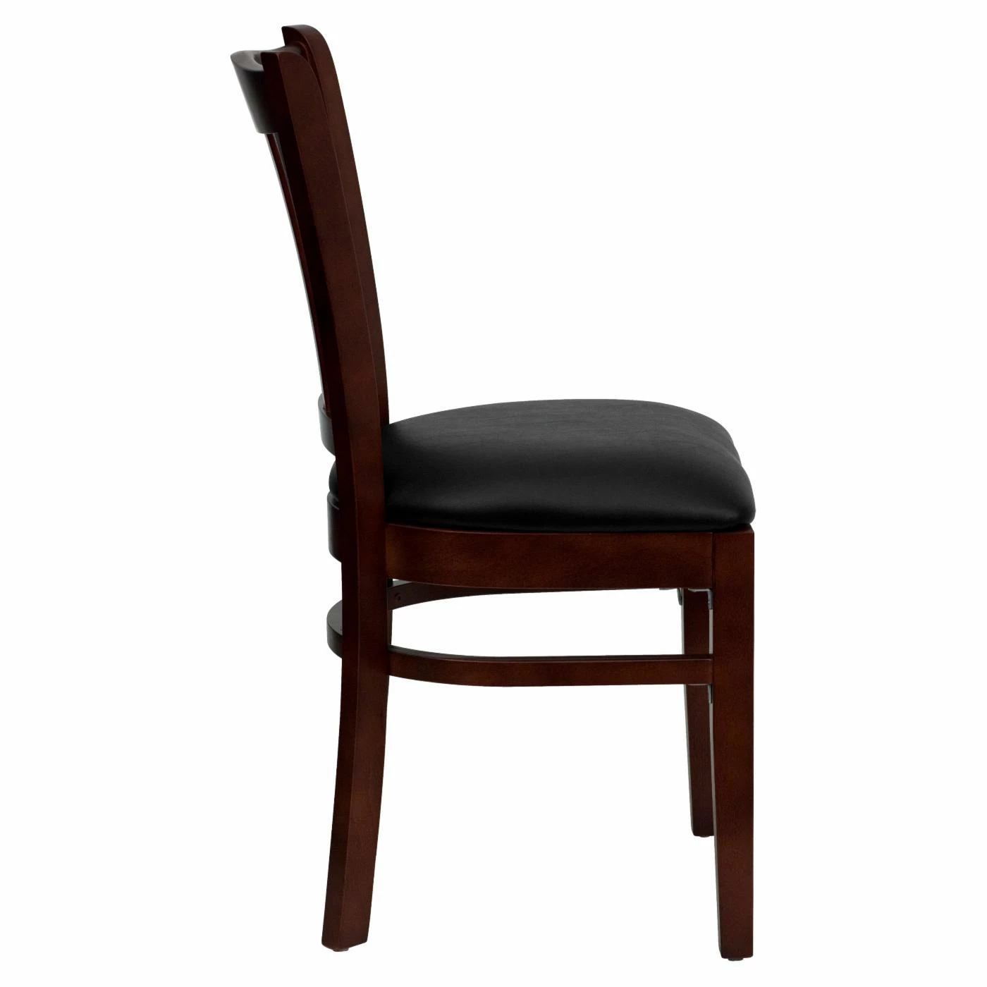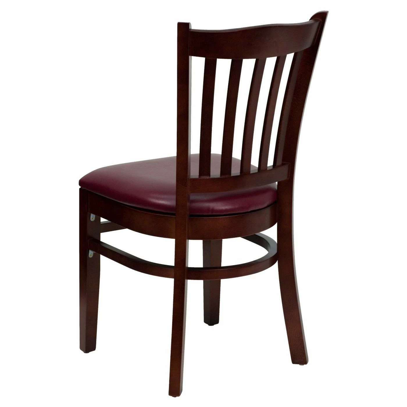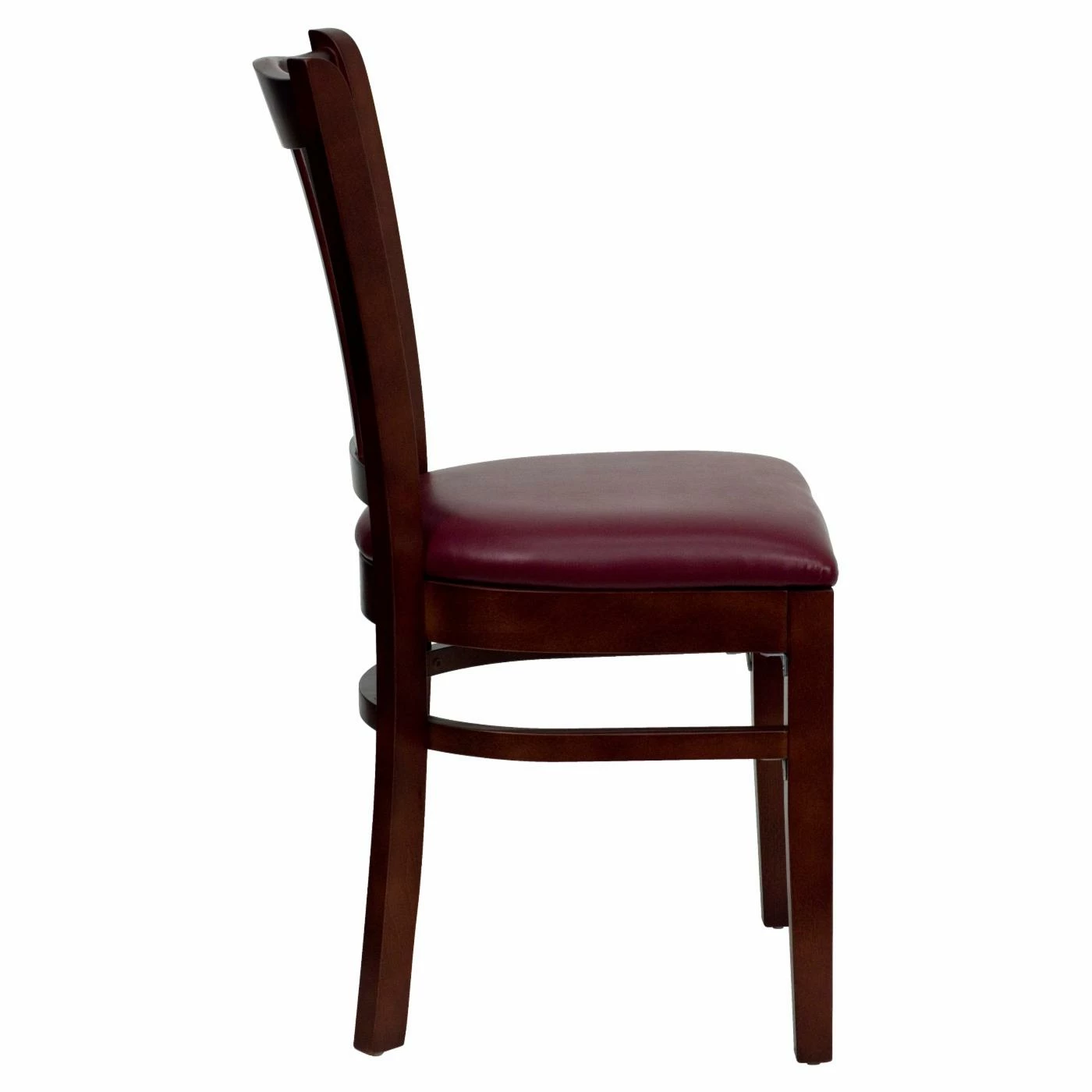 Durability and comfort meet in the design of the Flash Furniture Hercules 19.25 in. Mahogany Vertical Slat Back Restaurant Chair with Vinyl Seat. Masterfully crafted out of solid European beech hardwood using mortise-and-tenon construction and metal wood screw reinforcements, this traditional dining chair is sturdy and strong enough to stand the test of time in even the busiest of commercial dining rooms. For comfortable support, the chair boasts a tall back and 2.5 inches of foam padding on its seat. Vinyl upholstery gives the seat the feel of luxurious leather while ensuring that the chair is easy to clean. Plastic glides complete the design and provide protection for your flooring.