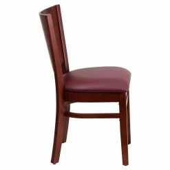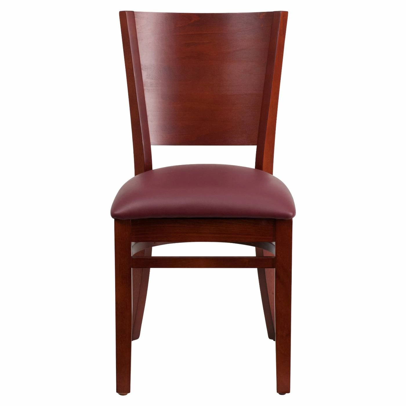 With its solid back, the Flash Furniture Lacey 20 in. Mahogany Solid Back Restaurant Chair with Vinyl Seat treats diners to optimal back support for comfortable dining. Adding to the comfortable design of the chair is the plush foam-padded seat and luxurious leather-like vinyl upholstery. Durably designed specifically for use in commercial settings, the chair is fabricated out of solid European beech hardwood using mortise-and tenon-construction techniques and is strengthened by metal wood screw reinforcements. Plastic caps on the feet allow the chair to glide over hard floors without causing damage.