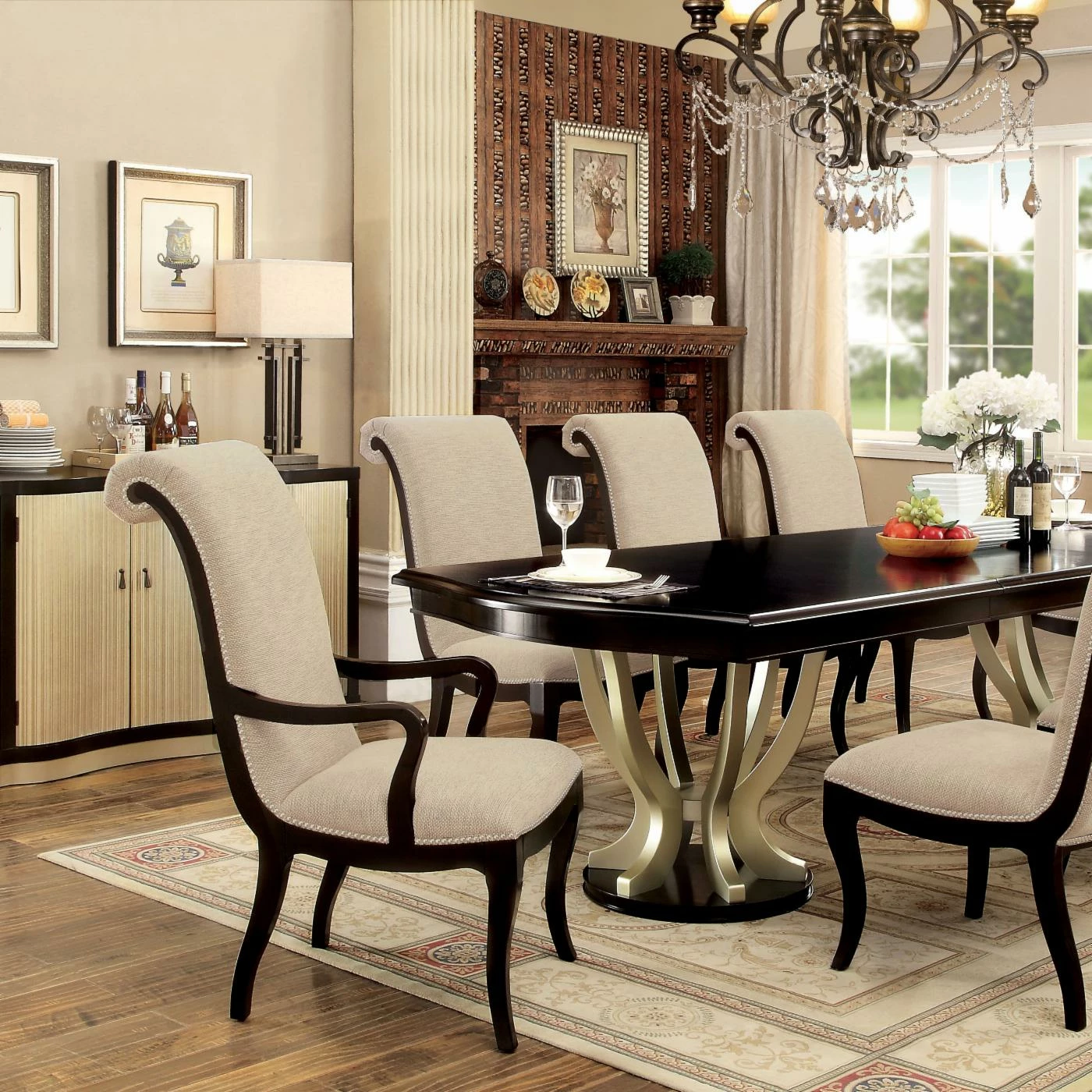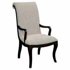 An elaborately scrolled back and bright nail head trim make the Furniture of America Cecille Scrollback Dining Arm Chair – Set of 2 a dazzling seating option for your formal dining room. To ensure this chair is as comfortable as it is stylish, it features generous cushioning and line-like fabric upholstery. Curing, slender arms and saber legs in a deep espresso finish offer elegant support. The set includes two dining arm chairs.