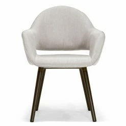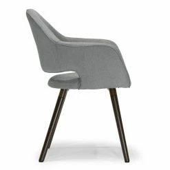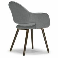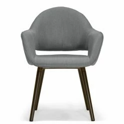 Flared, welted arms and an open back give the Glamour Home Adel Dining Chair – Set of 2 its mid-century appeal. Your choice of available fabric upholstery color makes this dining chair a good match to your space. It sits on flared beech wood post legs in dark brown. This set includes two dining chairs.