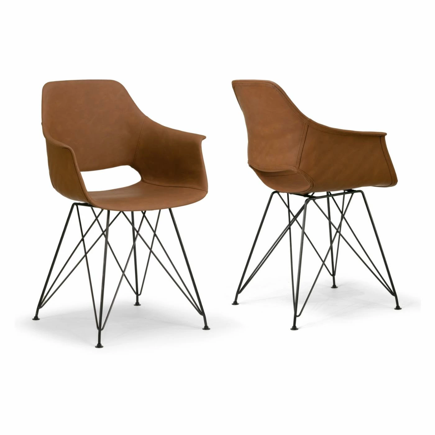 The Glamour Home Alora Keyhole Dining Arm Chair – Set of 2 looks like it arrived in your home straight from the pages of a home decorating magazine. Retro modern is always in and this set of dining chairs, which reimagines colors and silhouettes from previous decades with a modern eye, is no exception. Intricate geometric legs contrast with seats’ smooth faux leather upholstery in a warm caramel brown. Floor protectors on the legs prevent scratches and scuffs from marring your gleaming hardwood floors. Keep these chairs in your dining room so your furniture will look almost as good as your food. They also look at home in an office or a living room.