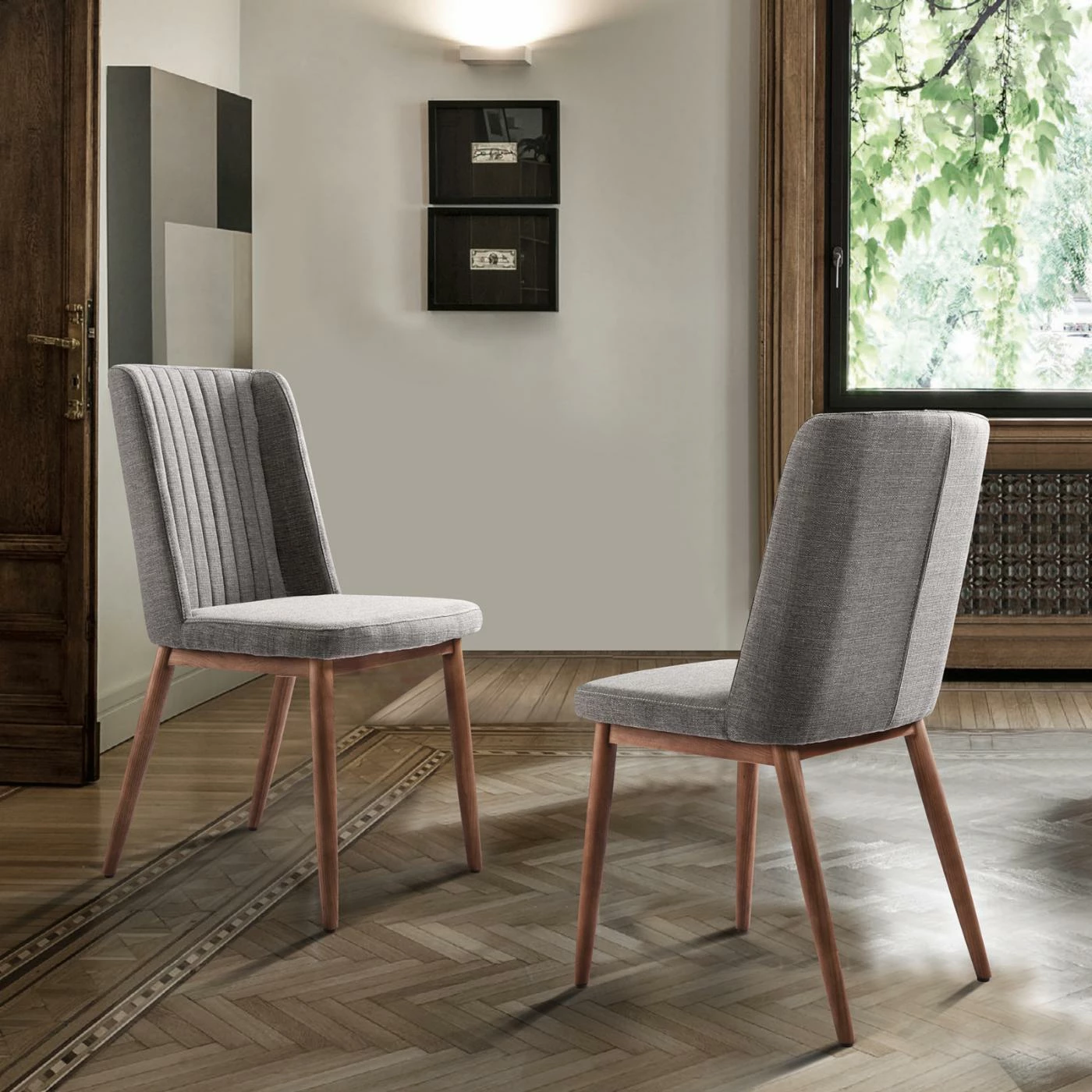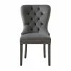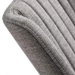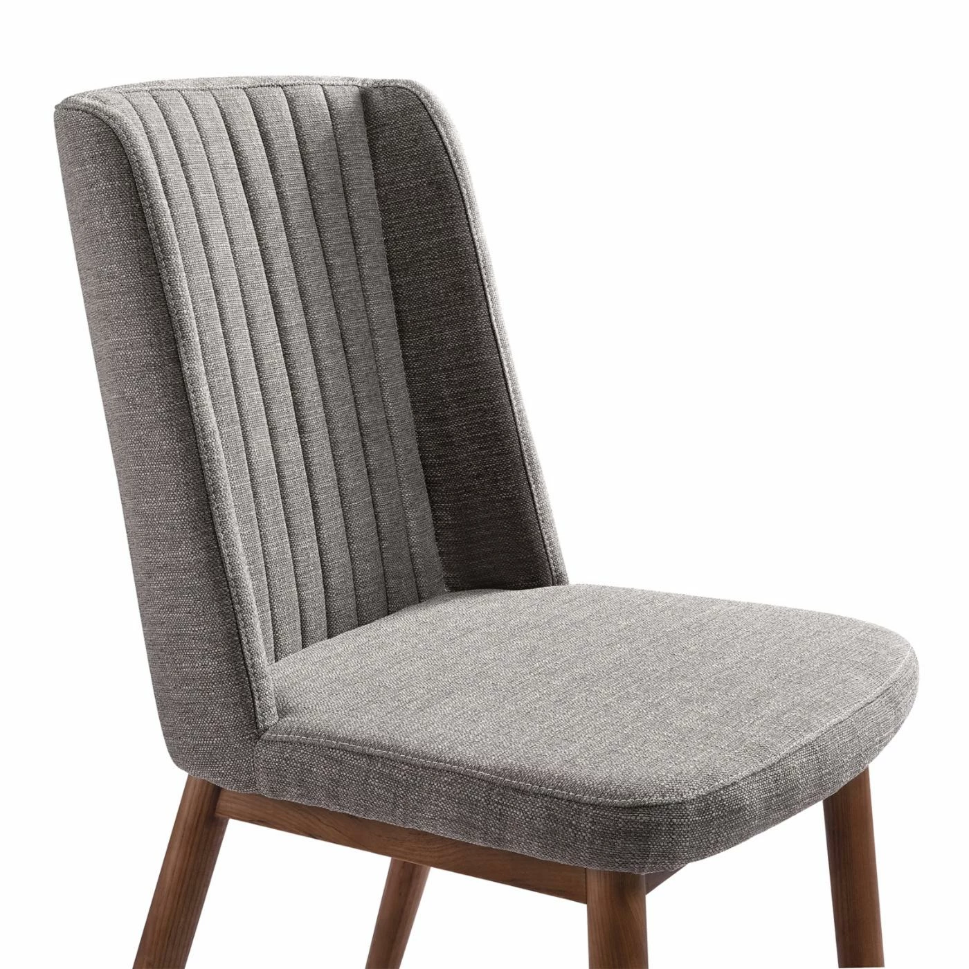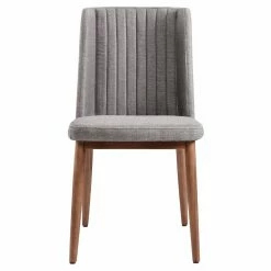 Expand your dining room seating with the Home Chic Palmas Upholstered Dining Chair – Set of 2. Two armless chairs are included in this set. The chairs are made of hardy wood with widely-set, round, tapered legs. A warm walnut brown finish tops the wood. The wide seats and tall backs come padded with high-density foam, upholstered in a stain-resistant gray fabric. Tufted vertical lines accent the backrests.