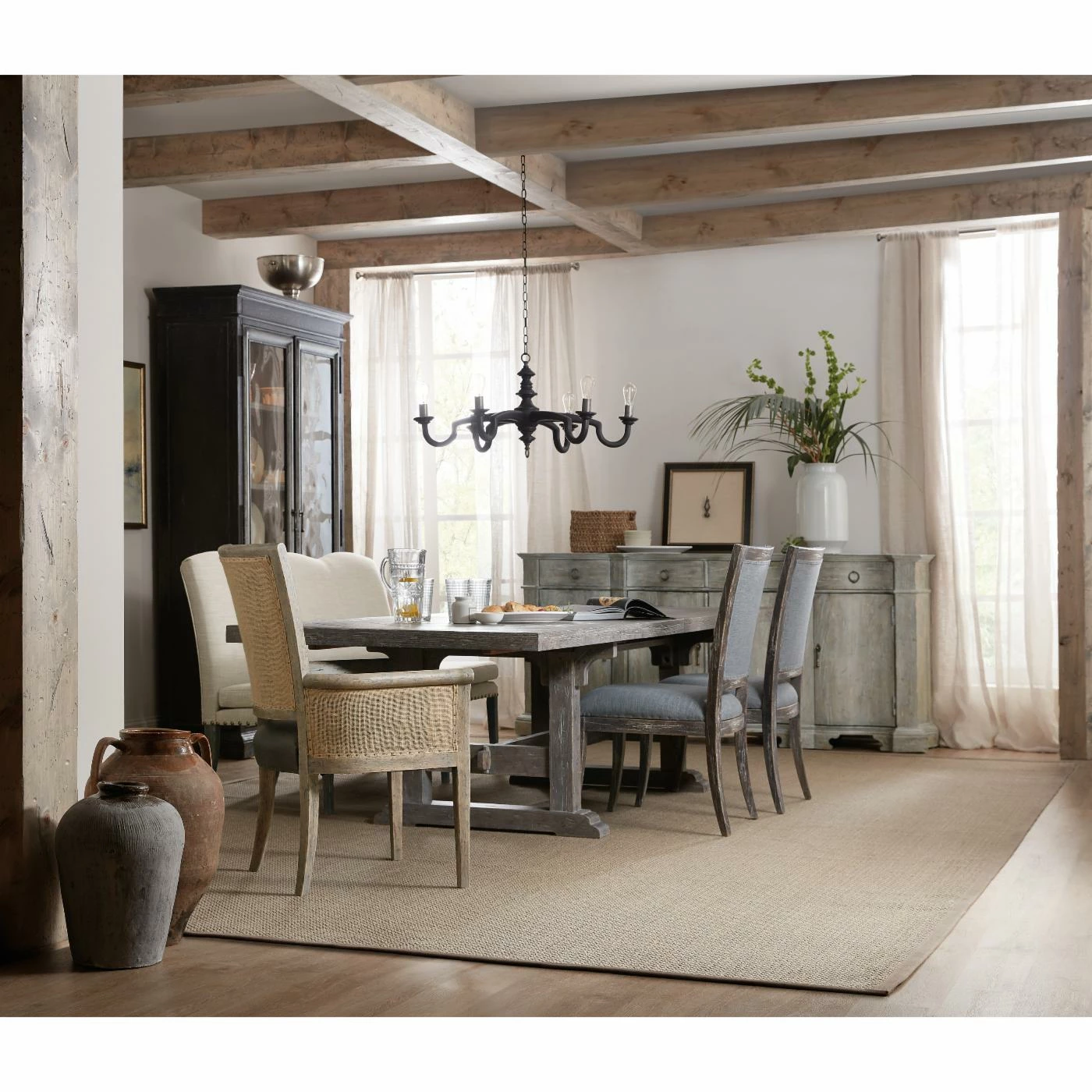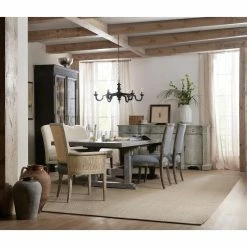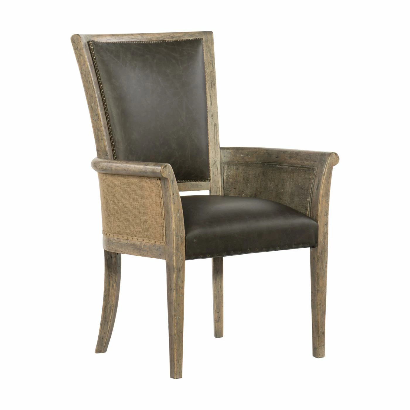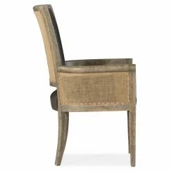 Bring a strong rustic touch to your living space with the Hooker Furniture Beaumont Dining Host Chair – Set of 2. The wooden frame is finished in a light distressed brown. The leather seating is lined with a bronze nailhead trip. The curved arms and the plush cushion give you and your guests a comfortable seat for any setting.