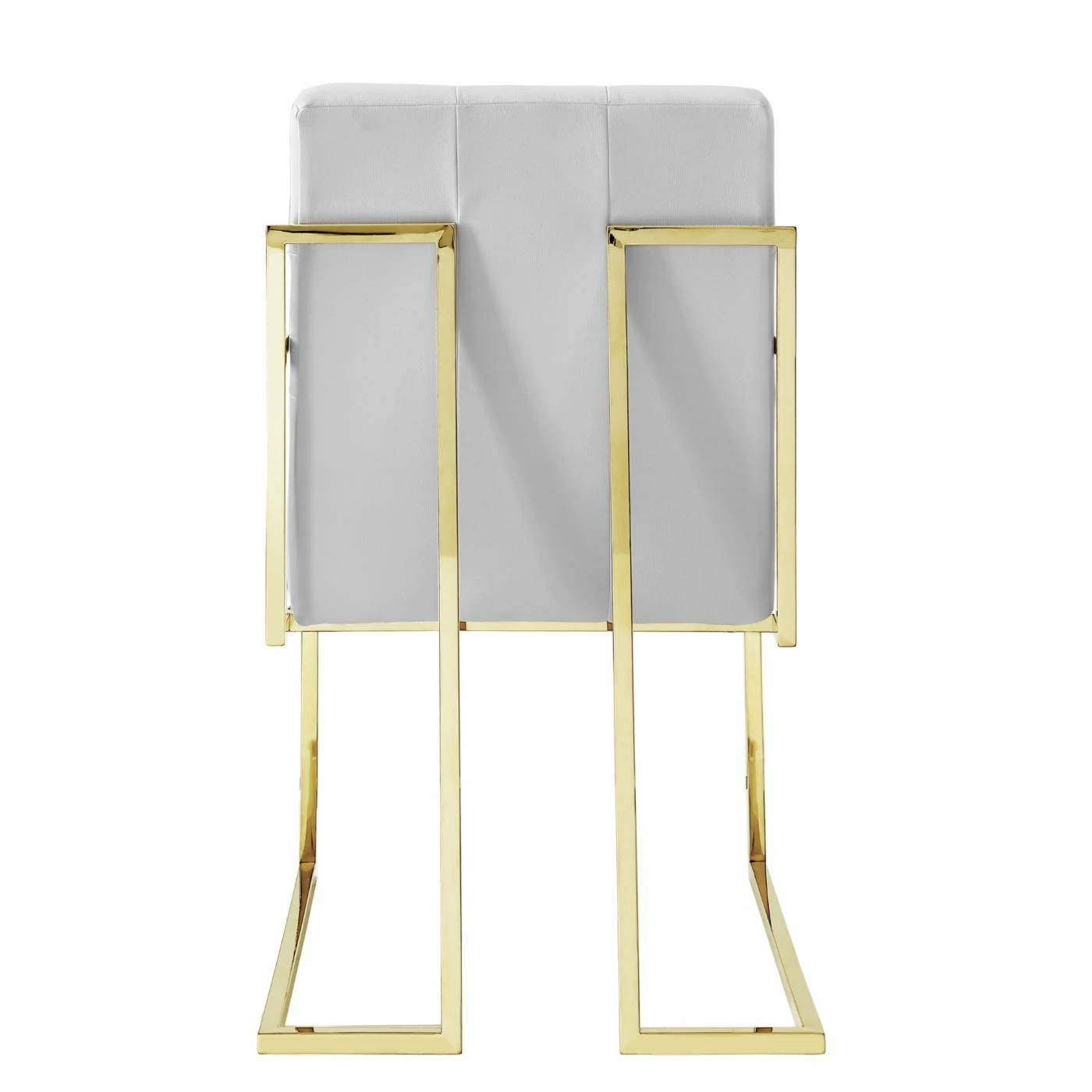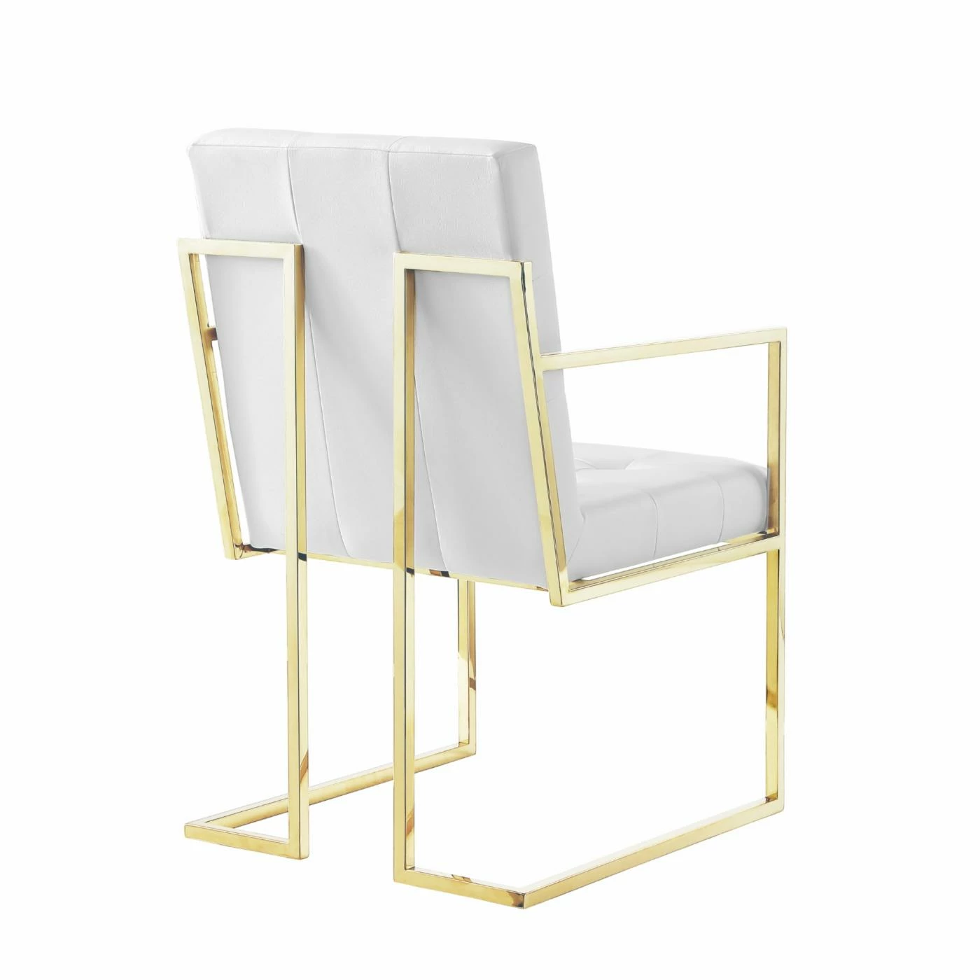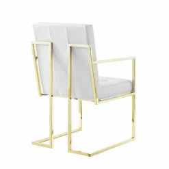 Kick your dΓ©cor up a notch with the Inspired Home Stevenson Dining Arm Chair – Set of 2. These geometric gems will make a statement in any room you put them in. The polished steel frame wraps around the chairs and adds art deco detail to both the backs and the durable arms. Square button tufting lends an air of elegance to the retro glam style. Use these chairs as seating for dining rooms, living rooms, bedrooms, or offices. Choose from available upholstery options to best match your home. Some assembly required.
