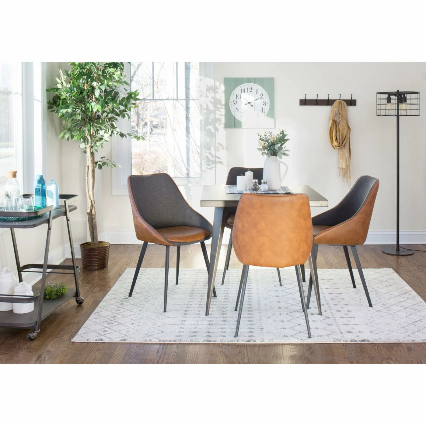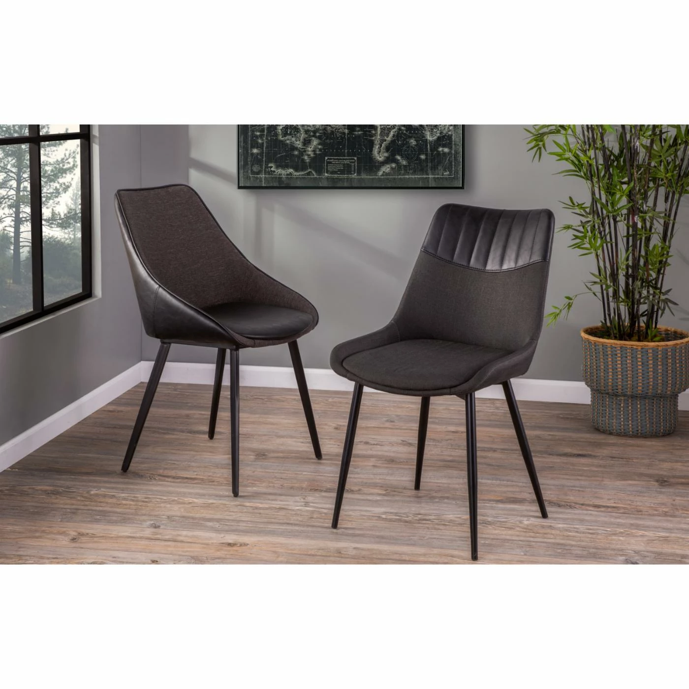 Two tones, two chairs, one striking mid-century design – the LumiSource Marche Contemporary 2 Tone Dining Side Chair – Set of 2 is a no-brainer for your modern living room or office space. These two side chairs are framed in sturdy metal. Gray angled legs bolster the padded, high-backed seats, which are upholstered in textured fabric and faux leather. Each offers interest with smooth leather backing and seat pads against fabric seat linings. Corded trim offers a tailored finish. Choose from the available finish options.
