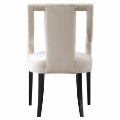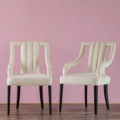 A curved backrest and ornate, notched arms, mark the New Pacific Direct Inc Viola Upholstered Klismos Dining Arm Chair as an ancient Greek klismos design. This version is updated by tapered legs in black and sumptuous velvet upholstery. Customize the look of this dining chair by choosing from available upholstery colors.