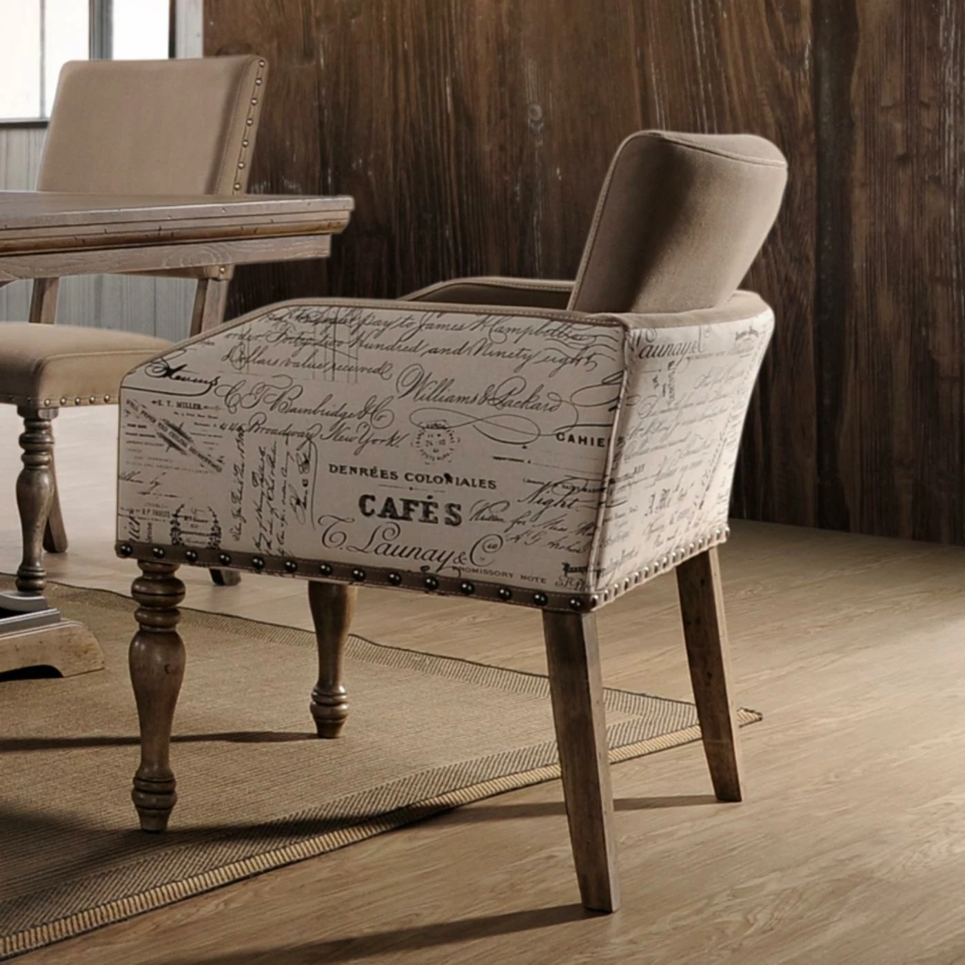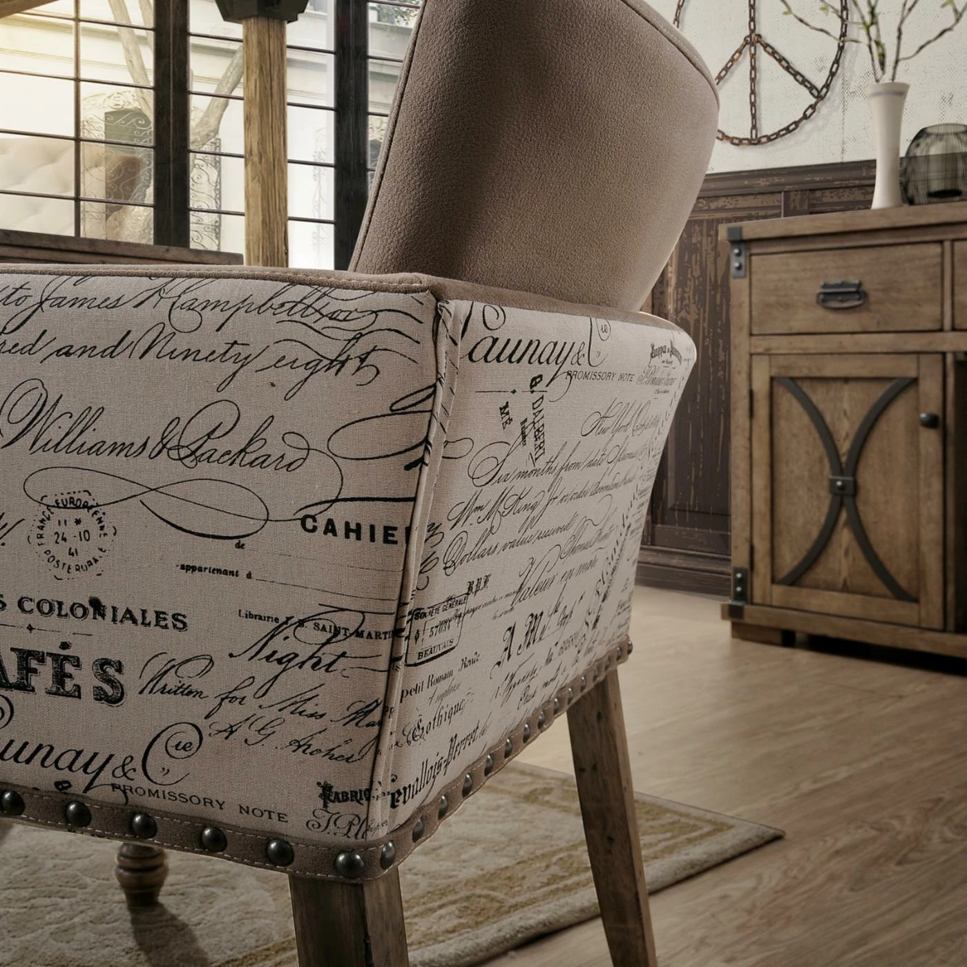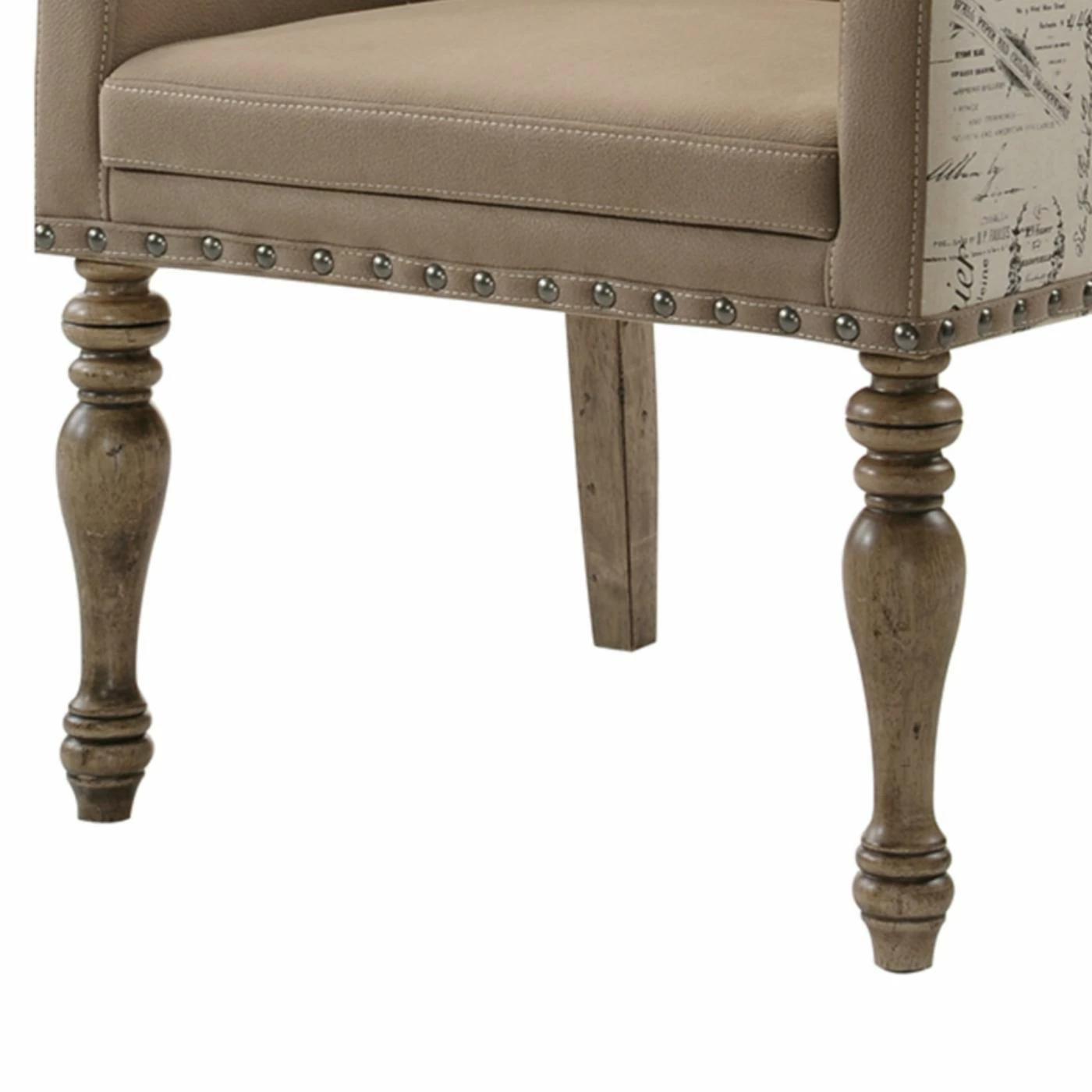 A glorious sonnet to the marriage of style and substance, the Roundhill Furniture Birmingham Script Nailhead Trim Upholstered Dining Arm Chair – Set of 2 is pure poetry in design. Sumptuous seating in microfiber is sure to make guests feel welcome, while the elegant script print enveloping the seat back and arms places design at the forefront. Finally, rustic nail head trim and driftwood finished turned legs complete this glorious dรฉcor centerpiece.