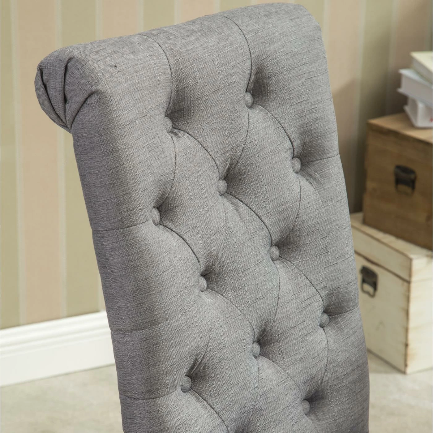- Gracefully curved, button-tufted chair back