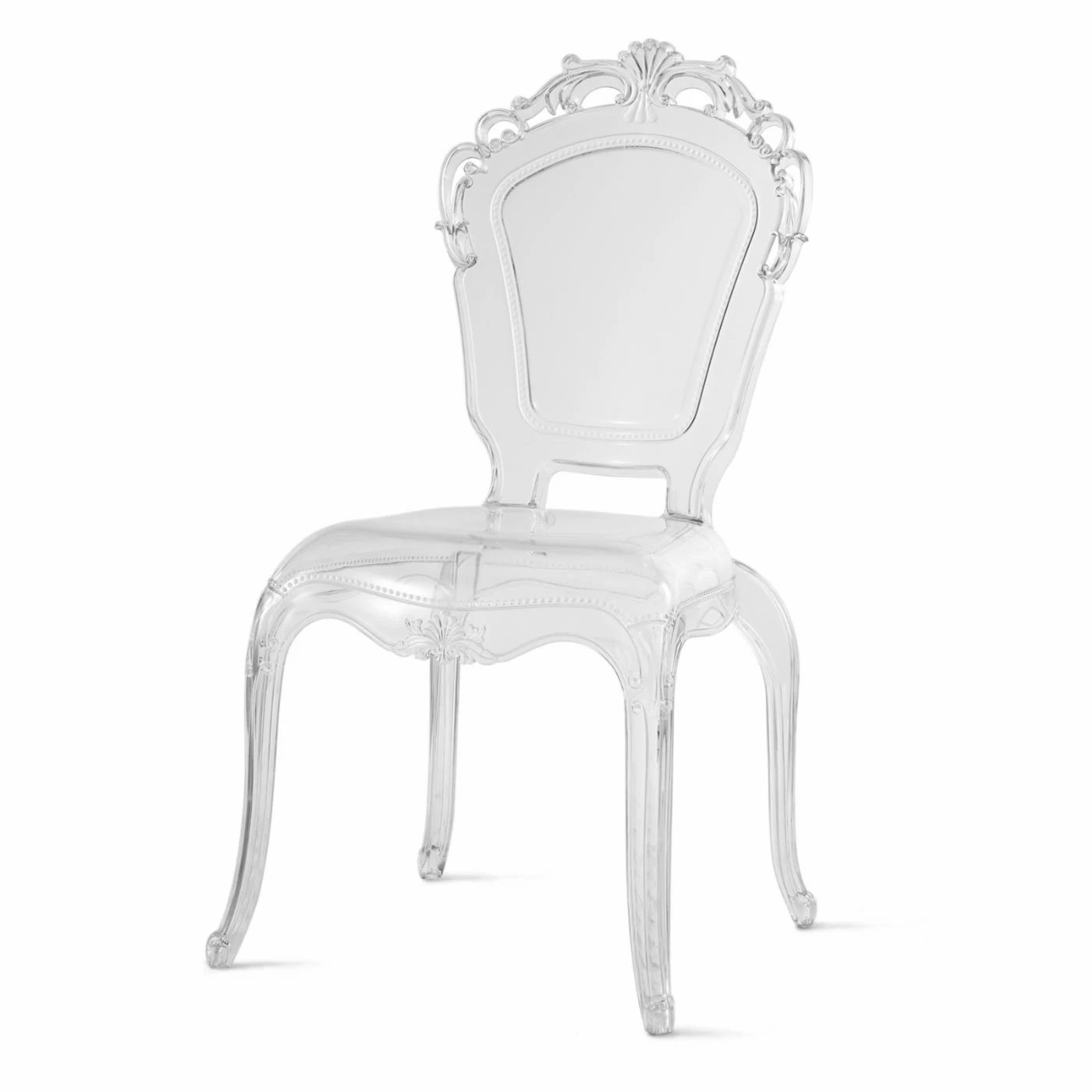 If the Warehouse of Tiffany Decorative Back Dining Chair – Set of 2 is representative of a particular design style, we’re going to say that it’s a perfect example of 21st Century Louis XVII. This chair set is inspired by the shape and detailing of antique furniture, but is formed entirely from clear polycarbonate for an edgy, modern touch. Polycarbonate offers the look of acrylic plastic, but is substantially stronger and better suited for daily use. These chairs provide contoured seats with curved backrests, wide arms, and plenty of detailing on all sides.