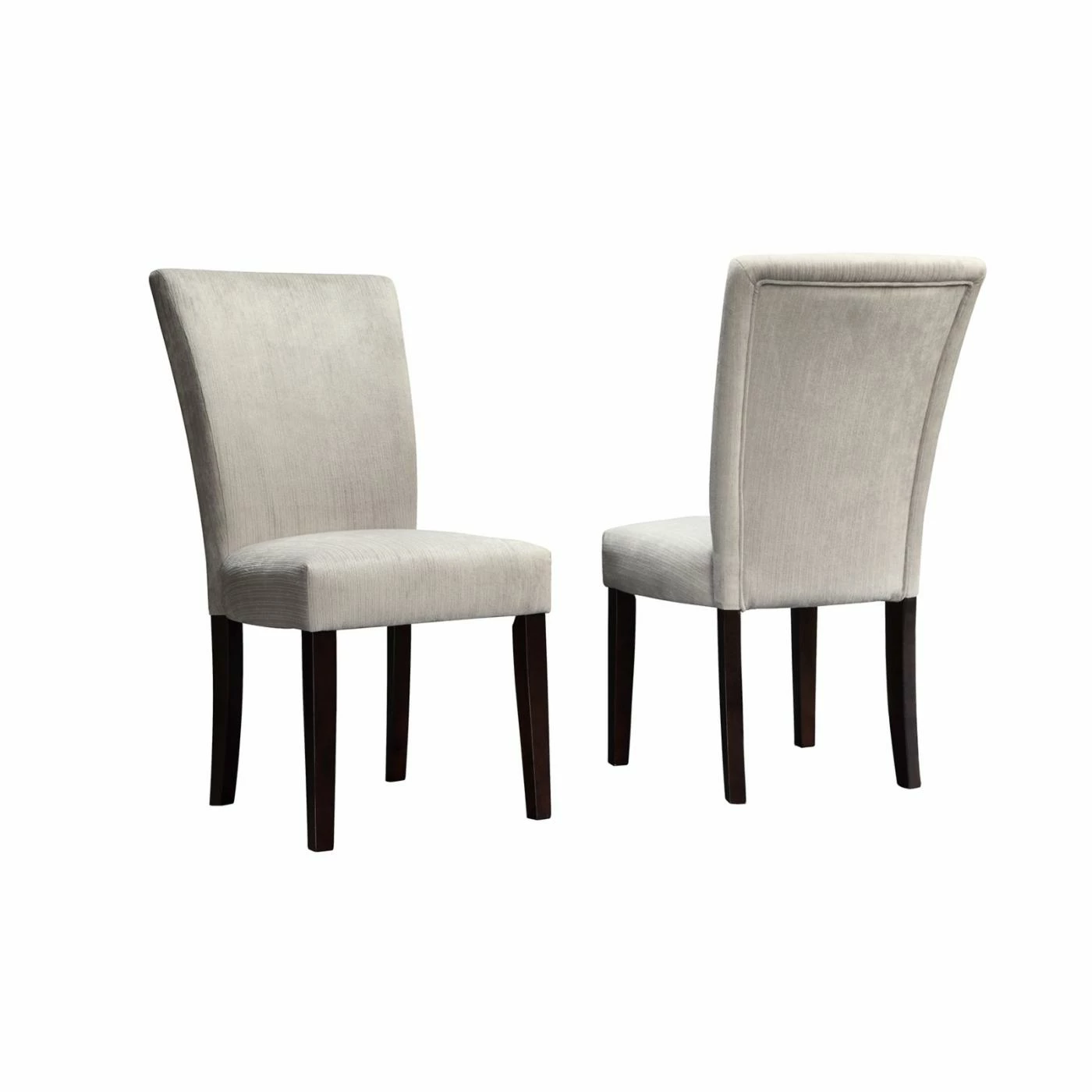 The ultra soft chenille upholstered Weston Home Royal Silver Gray Chenille Parson Chairs – Espresso – Set of 2 provide sumptuously comfortable seating. This set includes two parson’s style side chairs with rubberwood legs in a deep espresso finish. Silver gray chenille upholstery makes the spacious and padded seats and backrests even more comfortable.