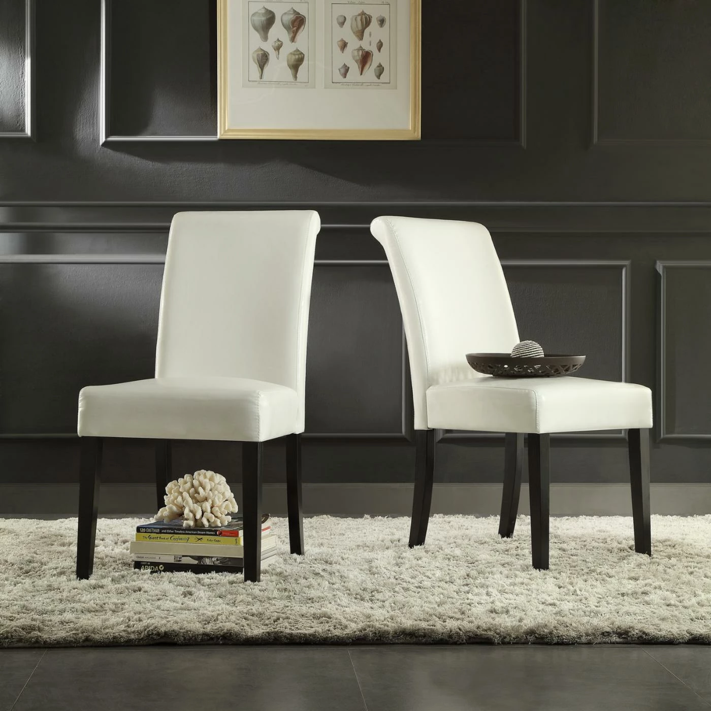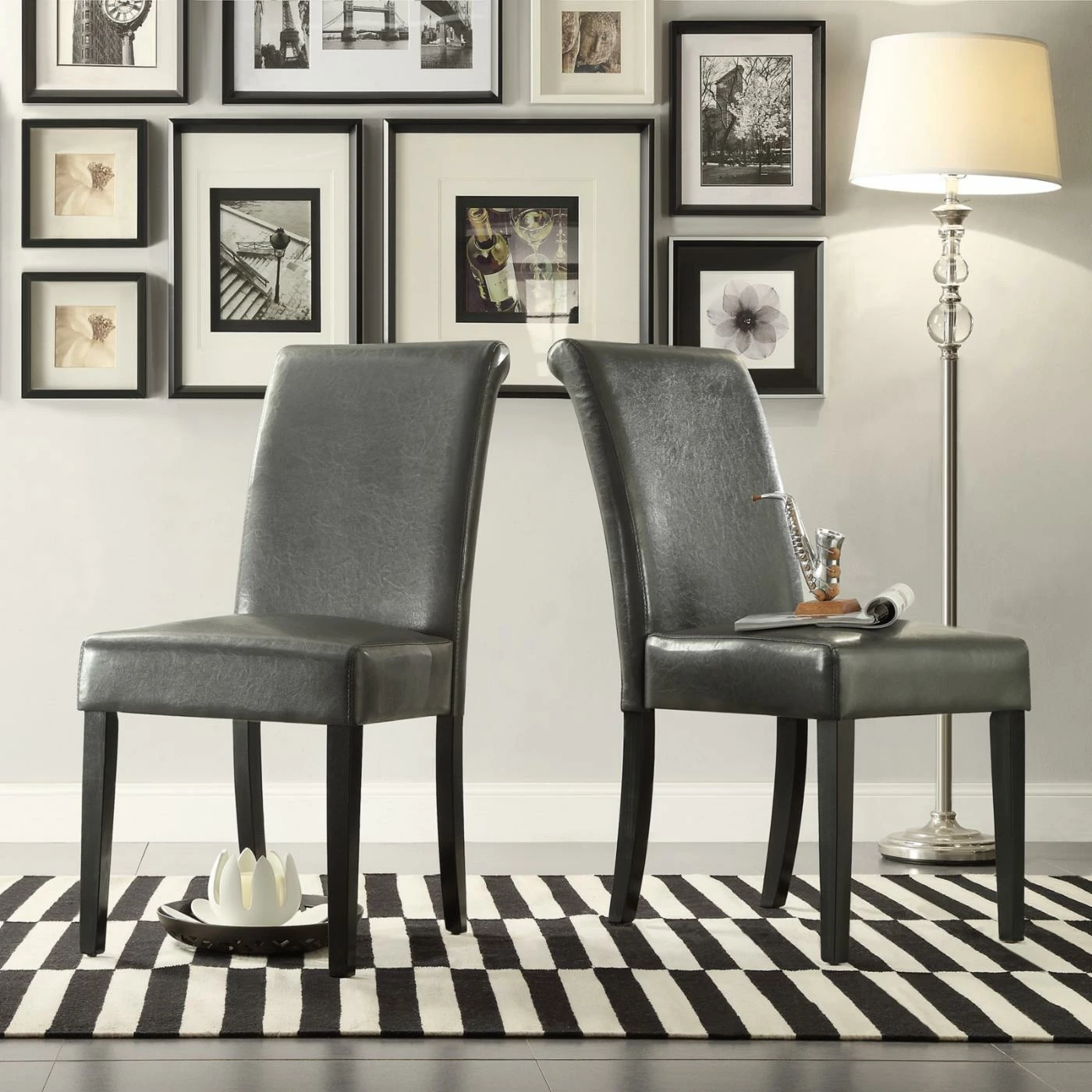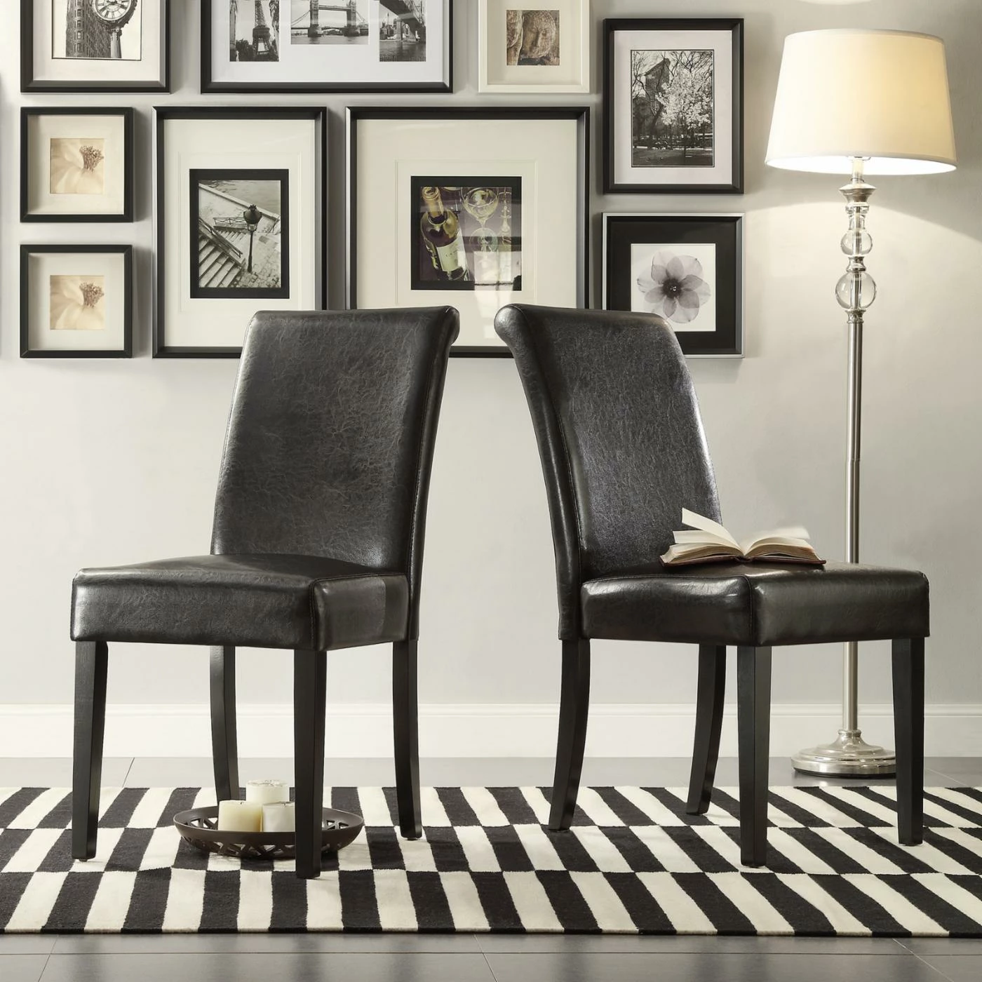Lustrous, supple faux leather makes the Weston Home Lexington Parsons Chair – Set of 2 an elegant way to complete your dining or seating area. Sturdy, black wood legs support the chairs and contrast with all of the available upholstery color options. To provide comfortable support, the seats are equipped with spring suspension and cushioned with foam.