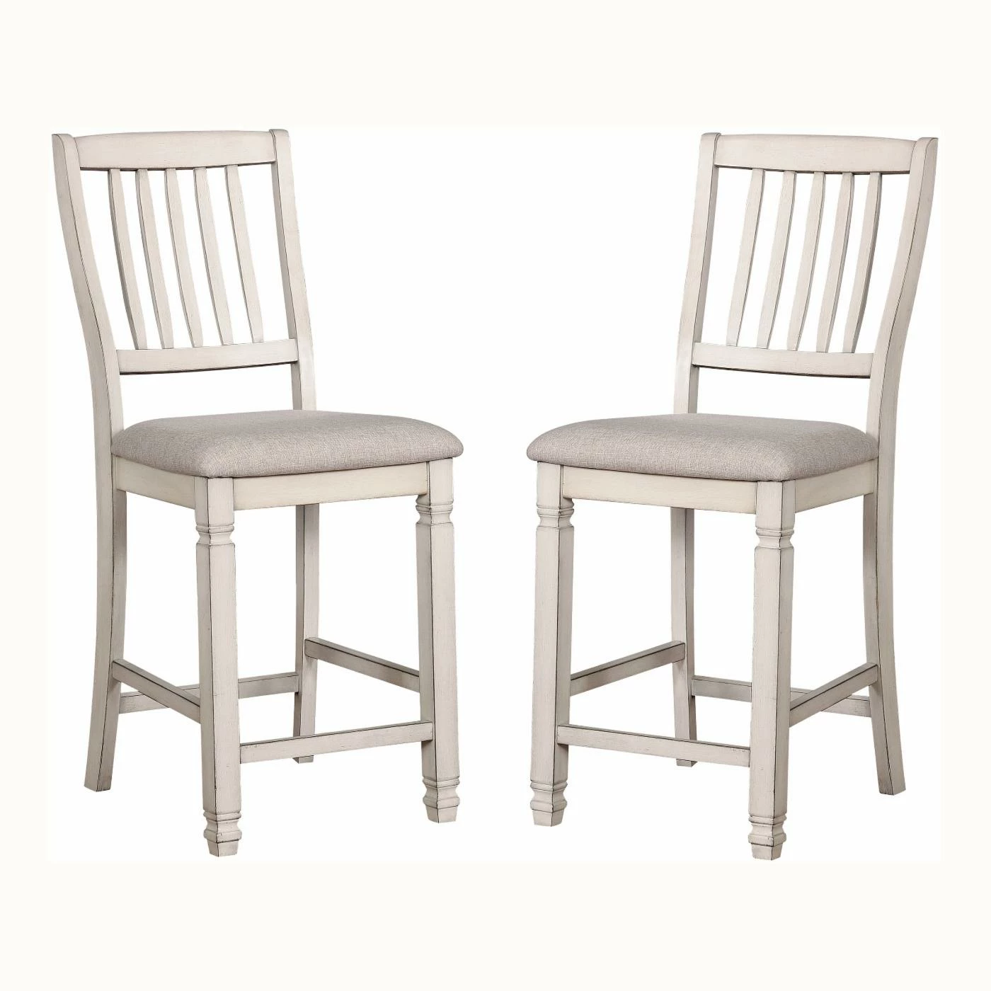 The Furniture of America Loretta French Country Weathered Counter Height Dining Chair – Set of 2 brings a sleek and tailored seating option to your dining area. Each of these chairs rest on solid wood and veneer frames. Thick foam padding on the seat and soft fabric upholstery ensure comfortable sitting. Slat backs complete these dining chairs.