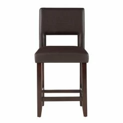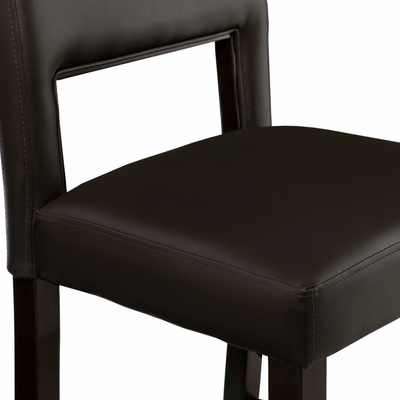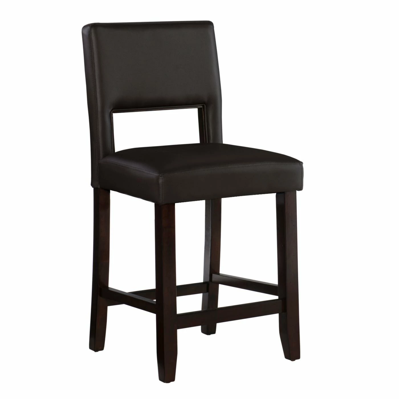The Linon 24-Inch Vega Counter Stool features a rich, dark espresso finish. A natural fit for any setting, this stool also has a PVC vinyl-covered cushioned seat and backrest in your choice of dark brown or white colors. The legs are slightly tapered to create a more elegant profile, while the four foot rails provide enhanced stability and comfort. This stool is durable enough for busy kitchens, yet refined enough for more formal settings.