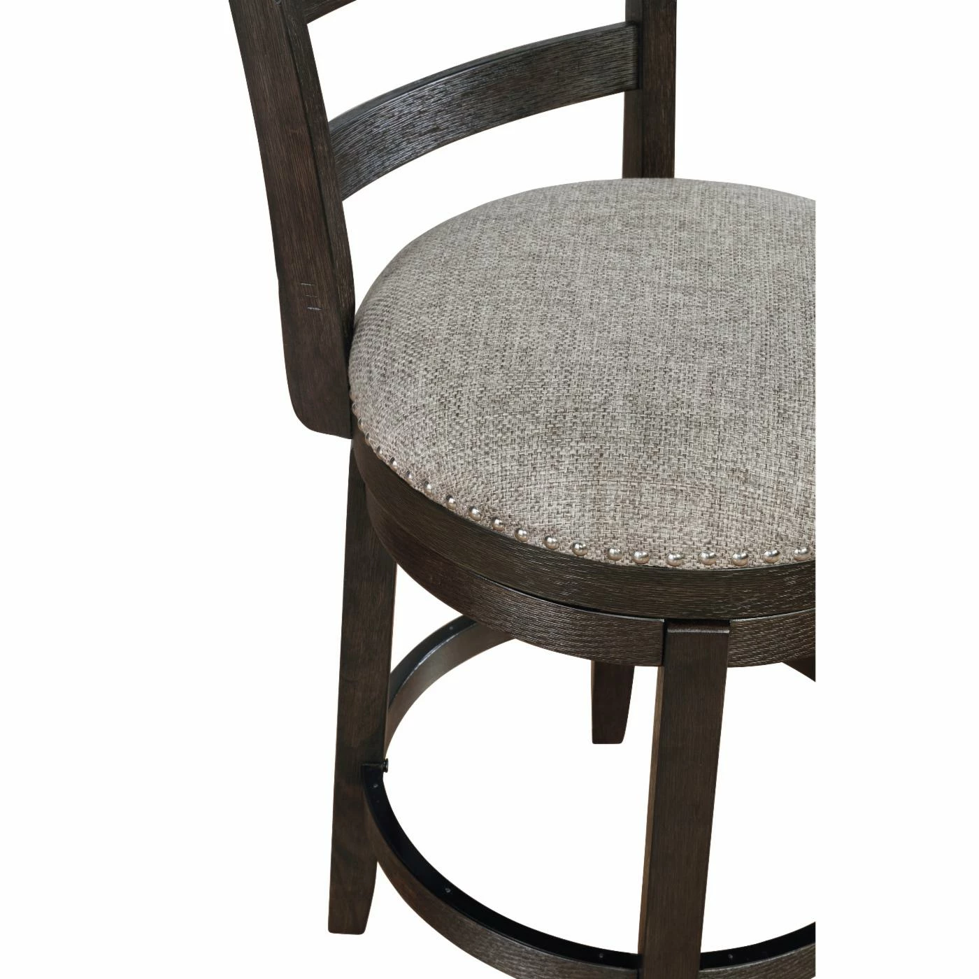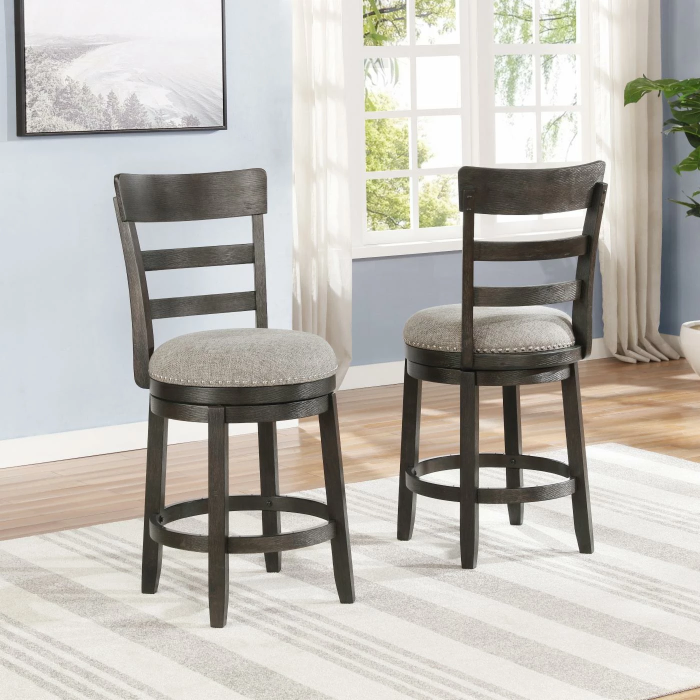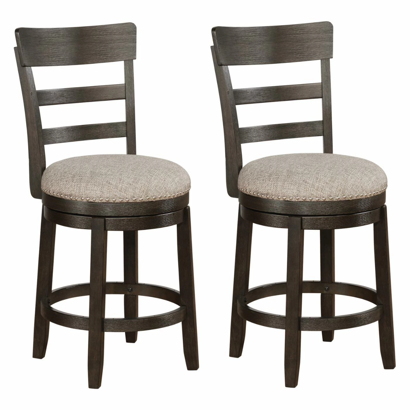 The Roundhill Furniture Kessel 25.5 in. Wood Swivel Counter Height Stool – Set of 2 is a well-appointed update to your counter-height dining space. This set of stools is crafted from acacia wood, engineered wood, and oak veneers in rich brushed brown finish. 360 degree swivel seats are upholstered in a stylish tan fabric with bronze nailhead trim. Classic ladder style backs and ring footrests add to its classic silhouette.