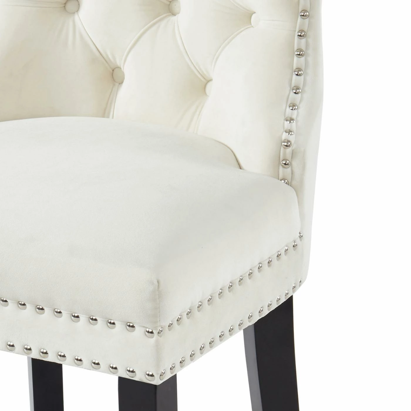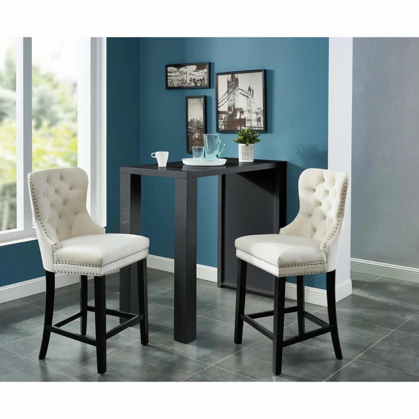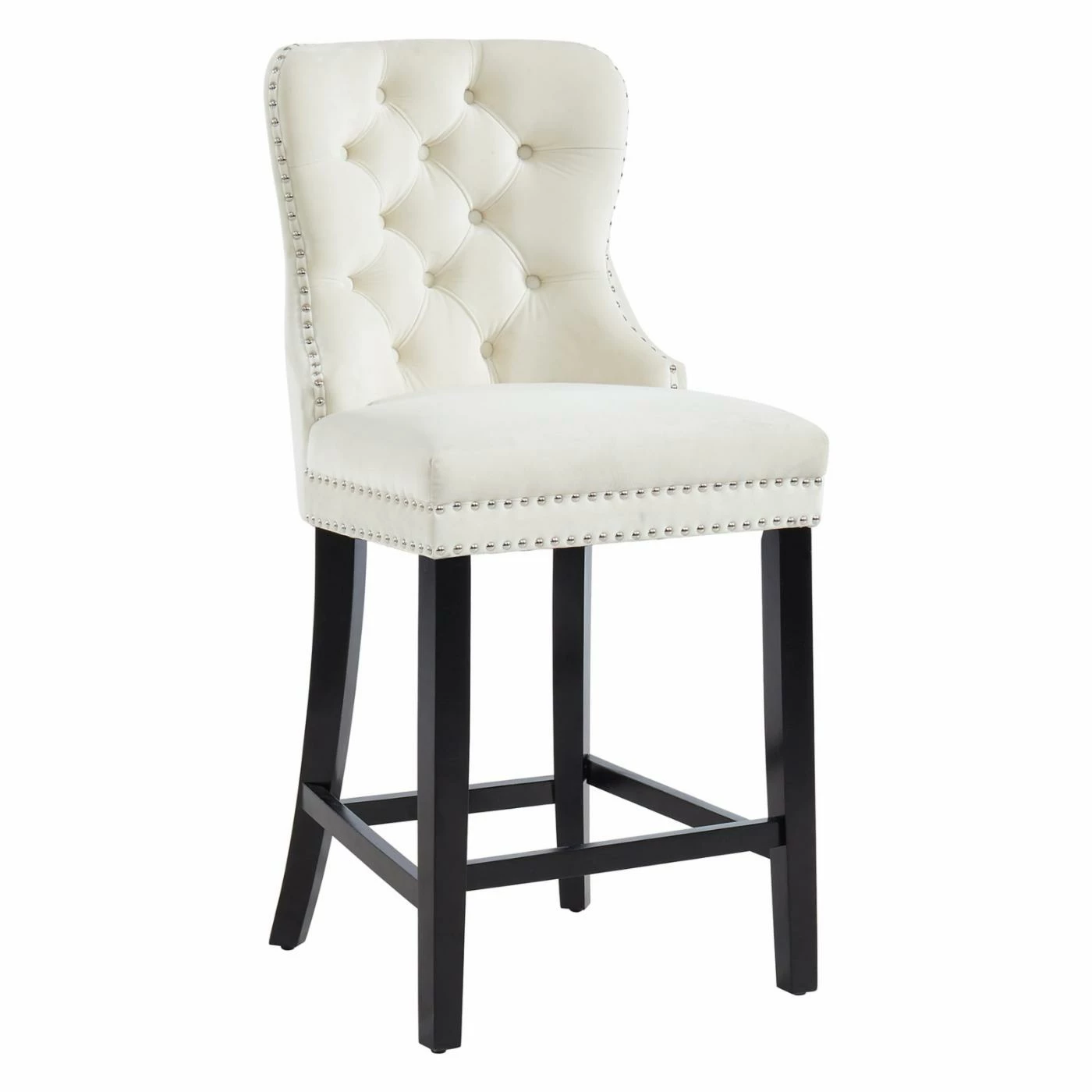 An elegant addition to your counter-height space, the Worldwide Home Furnishings Velvet Tufted 26 in. Counter Height Dining Side Chair – Set of 2 blends style and function effortlessly. Crafted with rubberwood legs and footrests in a sleek coffee finish, this pair of stools features comfortably padded seats and plush ivory velvet upholstery. Button tufting, nailhead trim, and chrome chair pulls elevate this set to a modern work of art.