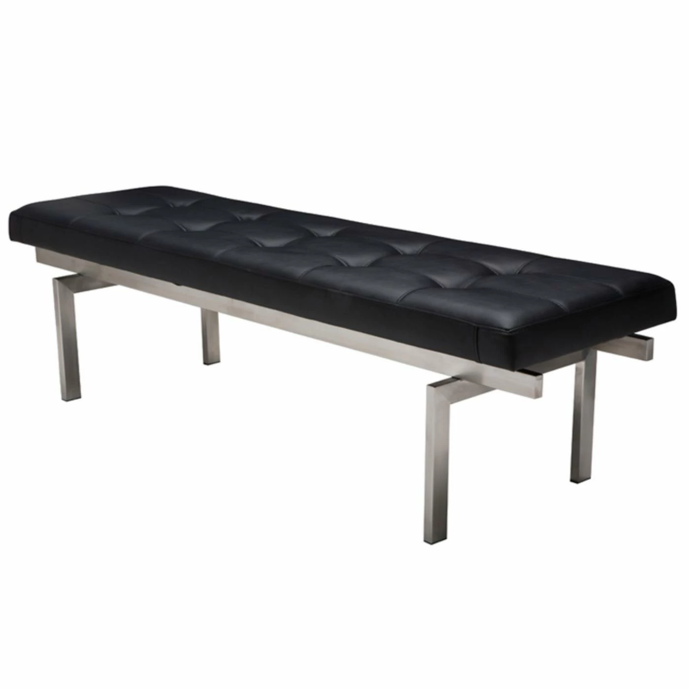 The chic and contemporary Nuevo Louve Bench lends a modern vibe to your home or office with its tufted, naugahyde upholstered cushions and minimal stainless steel construction. The materials used on this bench are durable and long lasting, sure to last many years for your enjoyment. Lighter weight and less bulky than a couch, the Louve Bench is the perfect seating solution; easily transport it to any room where it can best suit your needs.