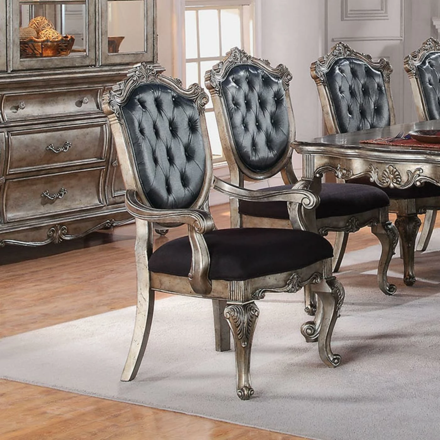The Acme Furniture Chantelle Dining Arm Chairs – Set of 2 is a classic Queen Anne-inspired couple that will suit the King and Queen of your own household quite nicely. This exquisite pair is crafted from solid wood in an antique silver finish complemented by silk-like fabric at the seat and back. Each chair flaunts such lovely woodwork as carved cabriole front legs, flared back legs, scrolled armrests, and an elegantly sculpted crown. Silver fabric adorns each side of the backrest, but shows off the added embellishment of button tufted accents on its interior while the plump seat is covered in the blackest material weβve ever witnessed. Some assembly is required.