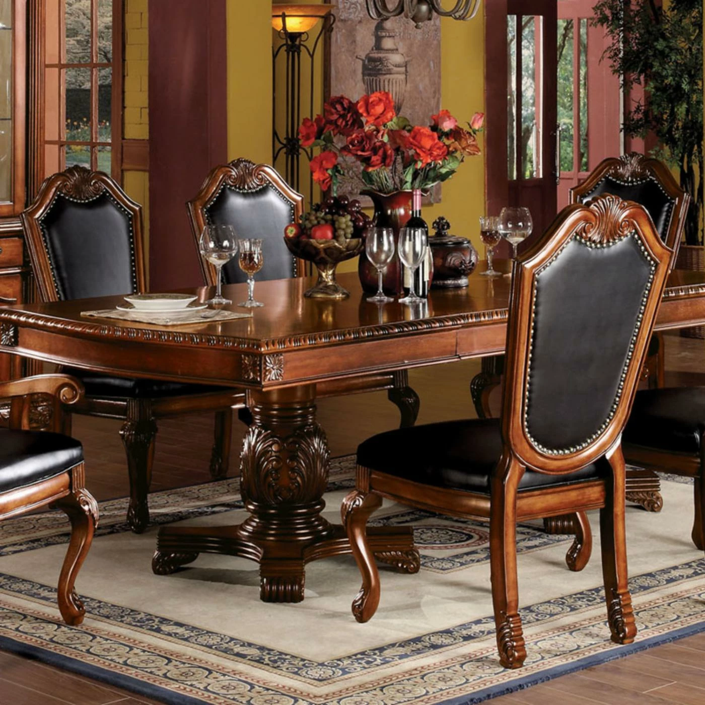 Make every meal feel like a special occasion with the addition of the Acme Furniture Chateau De Ville Dining Side Chairs – Set of 2 β Cherry to your dining area. Two matching side chairs are included in this seat. Both pieces are supported by a wooden frame and accented with carved surface details before being finished in a cherry color. The high back features a medallion carving at its crest and, like the seat, comes padded in foam before being upholstered in a rich, black faux leather.