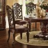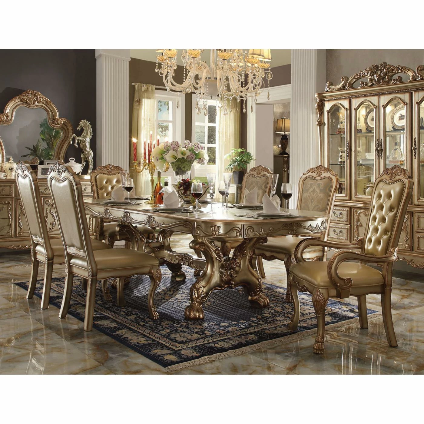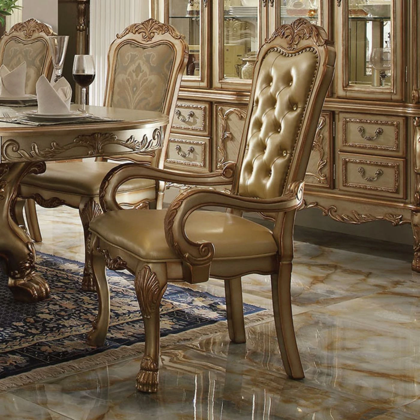A beautiful complement to your elegant new dining table, the Acme Furniture Dresden Dining Arm Chairs – Set of 2 – Gold Patina makes any meal feel like a stately affair. Two chairs are included in this set, both built from the same wood solids and finished in a handsome gold patina. Lovely curved armrests and claw feet provided a traditional-style feel, bolstered by carved surface details. The seat and back come padded thickly with foam, upholstered in a beautiful polyurethane leather in a bone color. The seat back features button tufting.