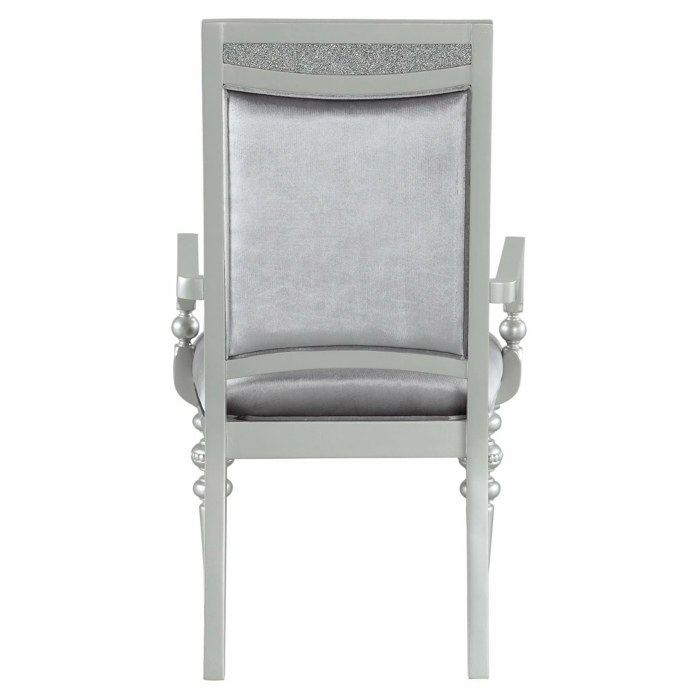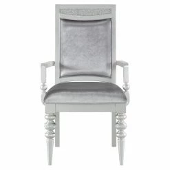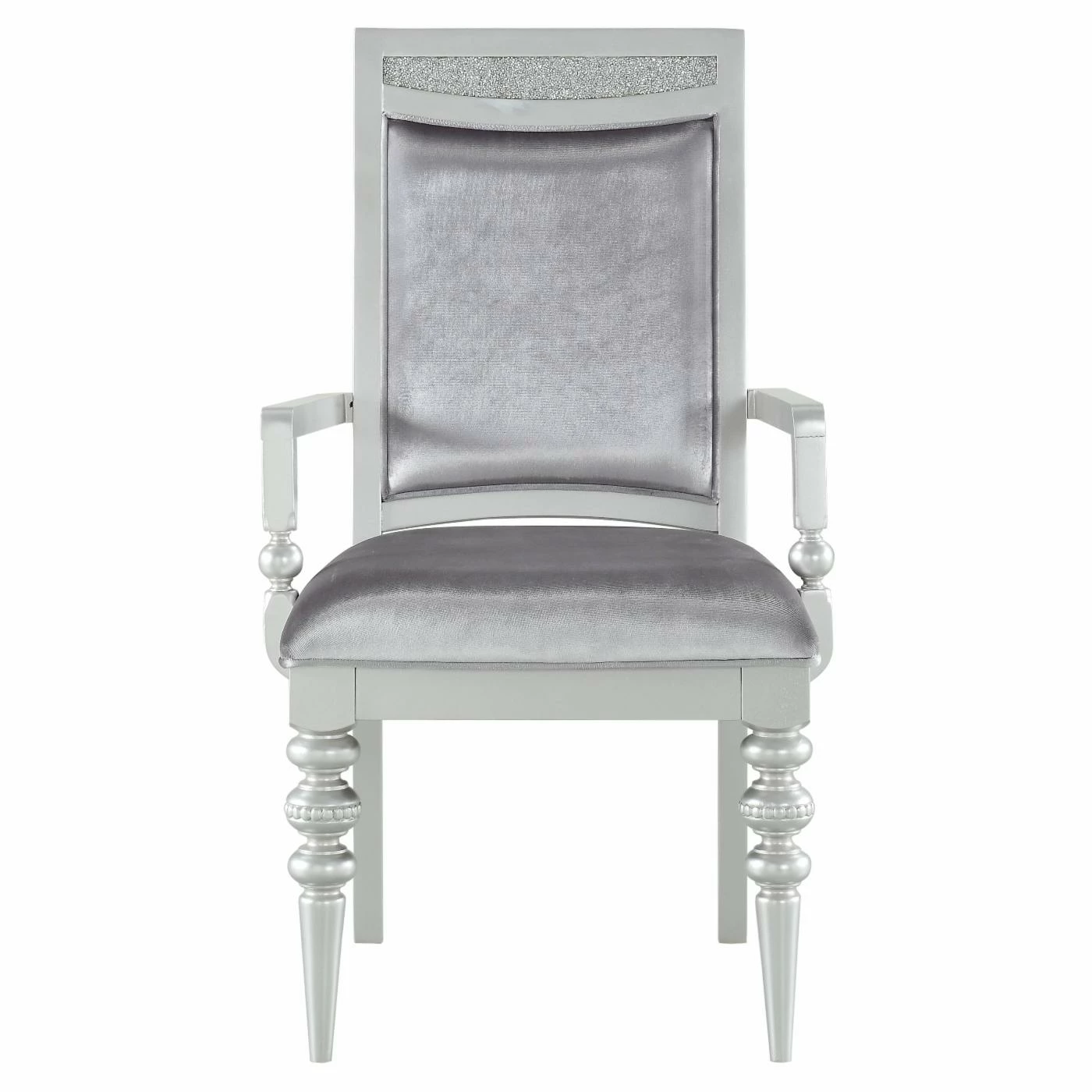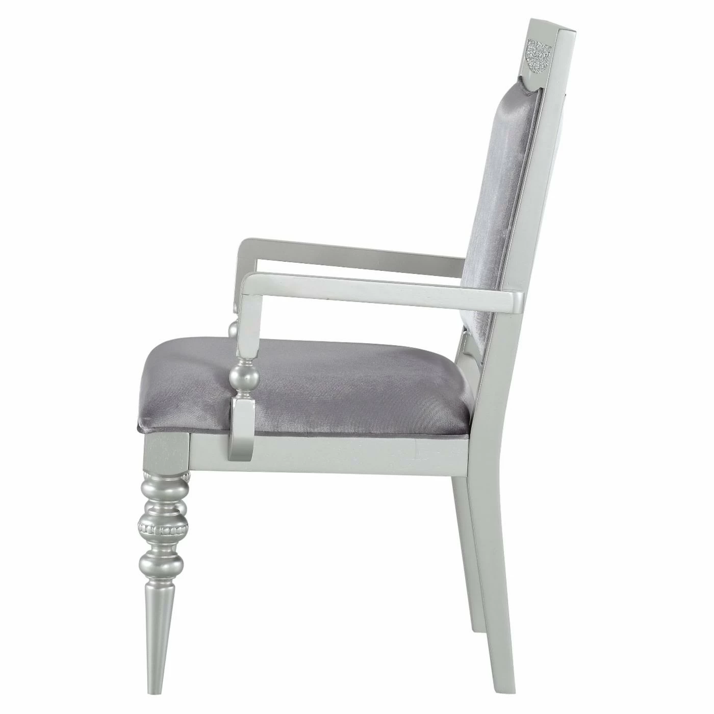 Make your dining room the centerpiece of your home with the Acme Furniture Maverick Dining Arm Chair – Set of 2. These unique dining chairs feature a padded fabric seat and back rests with a sparkling rhinestone inlay in a spectacular platinum finish. Comfortable and sturdy, these turned leg chairs are ideal for any dining or sitting area. Sold in sets of two.