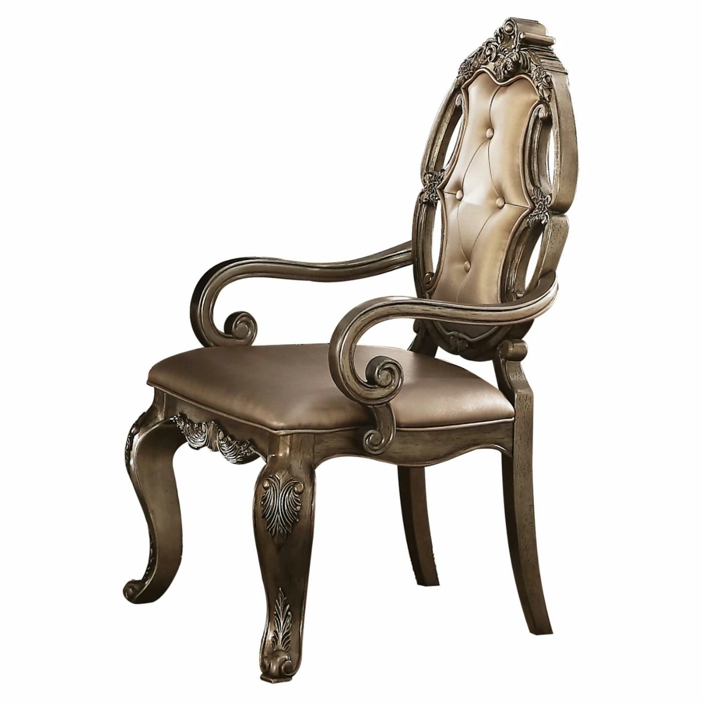 Like you, the Acme Furniture Ragenardus Dining Arm Chair – Set of 2 was inspired by the elaborate Rococo style movement. This set includes two elegant dining chairs with scrolled arms and carved, oval shield backrests. Each chair is upholstered in champagne faux leather and sits on carved cabriole front with flared back legs. The vintage oak finish has a lustrous metallic sheen.