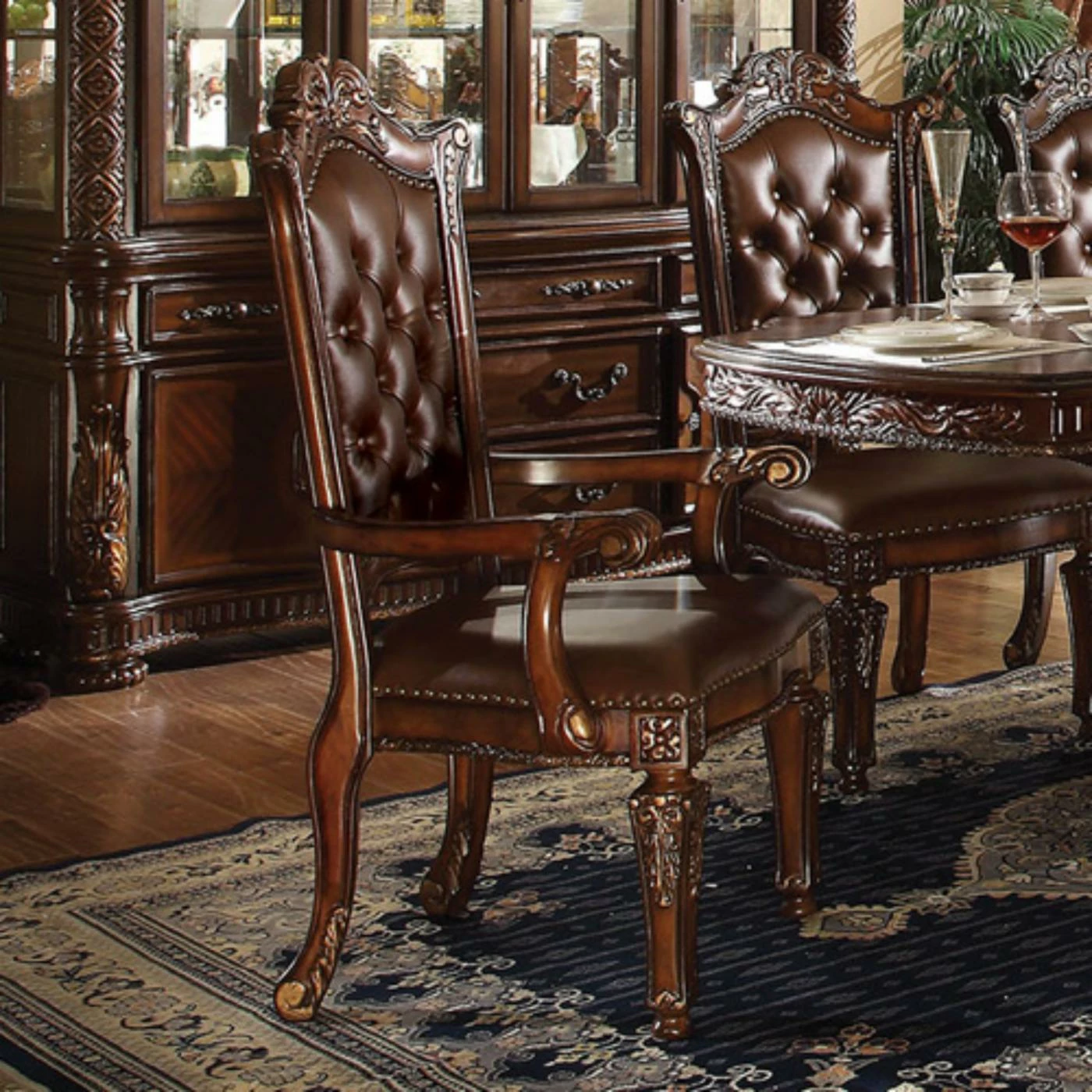 - Nailhead trim and baroque carved details