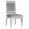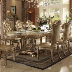Inspired by the Baroque era, this Acme Furniture Vendome Tufted Dining Side Chairs – Set of 2 – Gold Patina is generously scaled and intricately carved. This set includes two grand side chairs with rich brown faux leather upholstery and button tufted back details. The chairs are made of aspen and poplar in a cherry finish with crackled gold patina accents. Ornate carvings grace the arched back and tapered legs, highlighted by hand-brushed gold leaf.