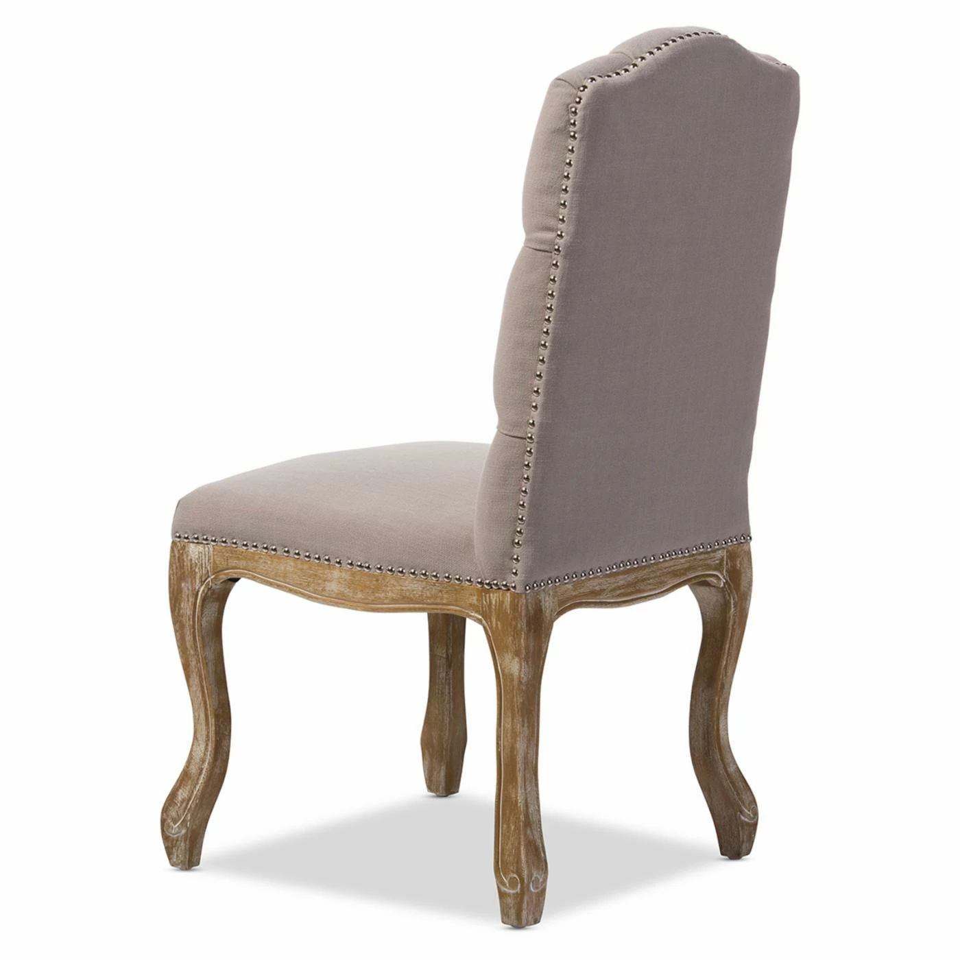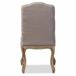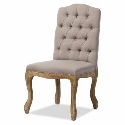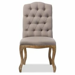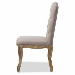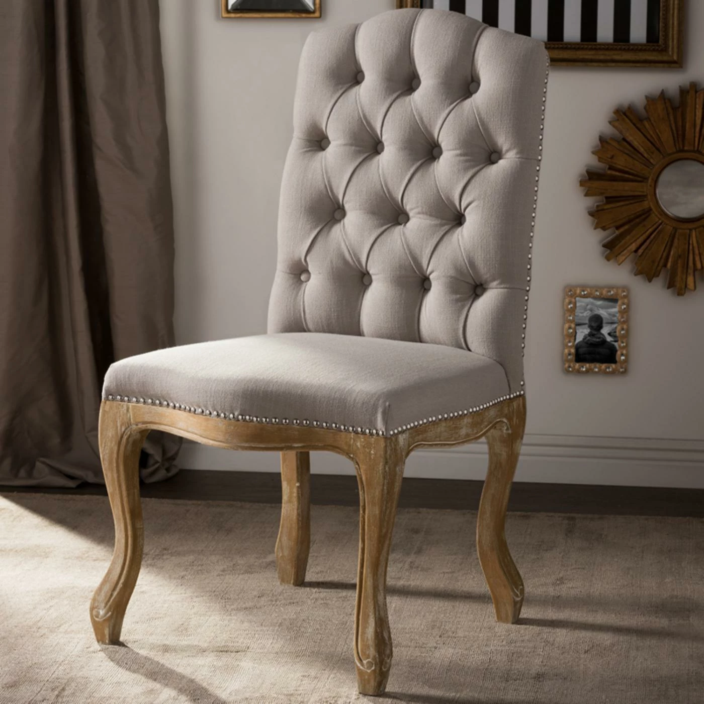 Your casual chic dining space craves the Baxton Studio Hudson Upholstered Dining Chair. Deep button tufting and bright nail head trim add elegant detail to this comfortable dining chair. It’s upholstered in a versatile beige linen blend. Cabriole legs on this chair are curvy and come in a weathered brown finish that enhances the relaxed vibe.