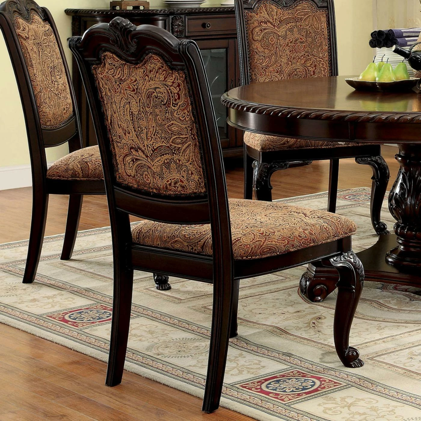 The regal fabric upholstery, elaborate wood carvings, and rich brown cherry finish make this elegant side chair a must for any formal dining table. The Furniture of America Bershire Fabric Padded Dining Side Chairs – Set of 2Β is crafted from solid wood and wood veneer with thick cabriole front legs. The seat and back are both upholstered in filigree patterned crimson and gold fabric that covers generous padding for added comfort.