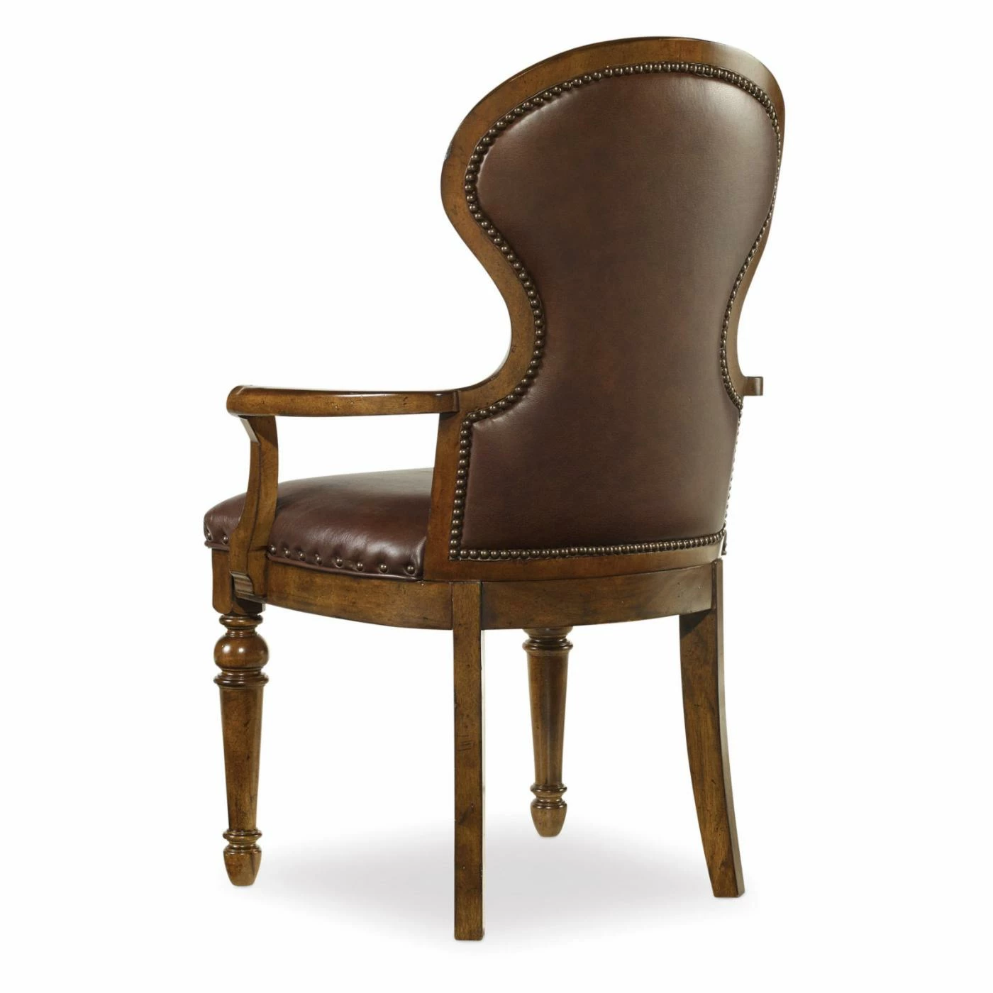 Finish off your dining room dΓ©cor with a touch of rustic elegance, compliments of the Hooker Furniture Tynecastle Upholstered Dining Arm Chair – Set of 2. This traditional dining chair is inspired by the furnishings found in stately English manor country homes, where luxury and ruggedness meet. Its shaped back, curved arms, and turned legs reflect the lines of Georgian architecture, which dominates the region. Figured alder veneers show off an appealing grain pattern and bring rich warm color to the design. Genuine chocolate brown leather upholstery and antique nailheads give a nod to the opulent accents of the palatial countryside estate. For durability and a flawless finish, the chair is constructed out of hand-selected poplar hardwoods, and the veneers are applied through a 16-step hand-application process. Padding on the backrest and seat treat you to plush comfort while you dine.