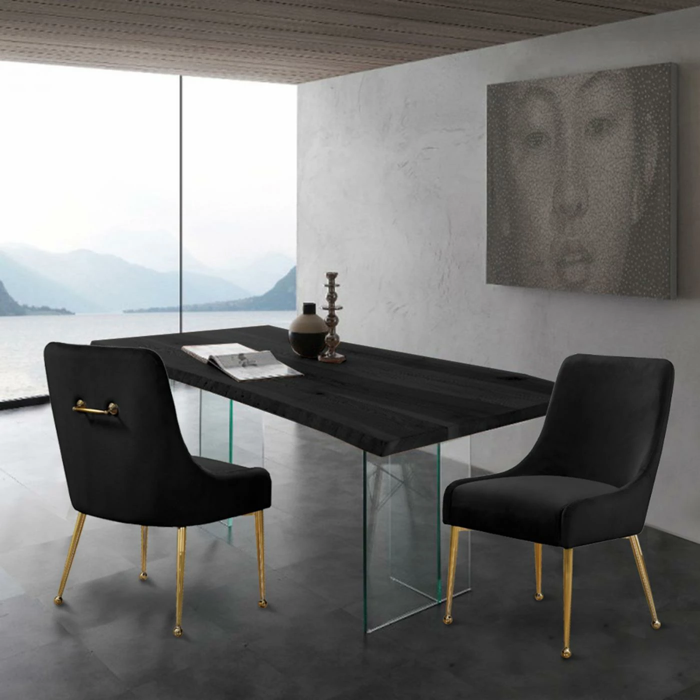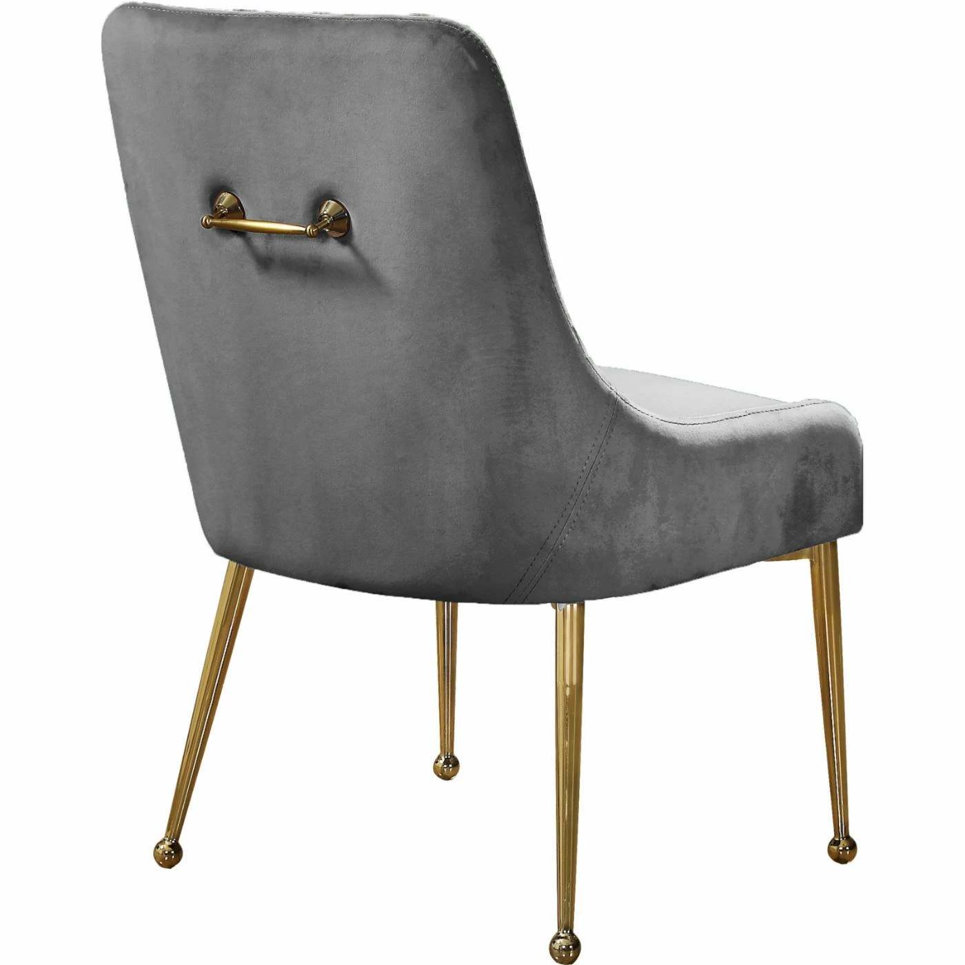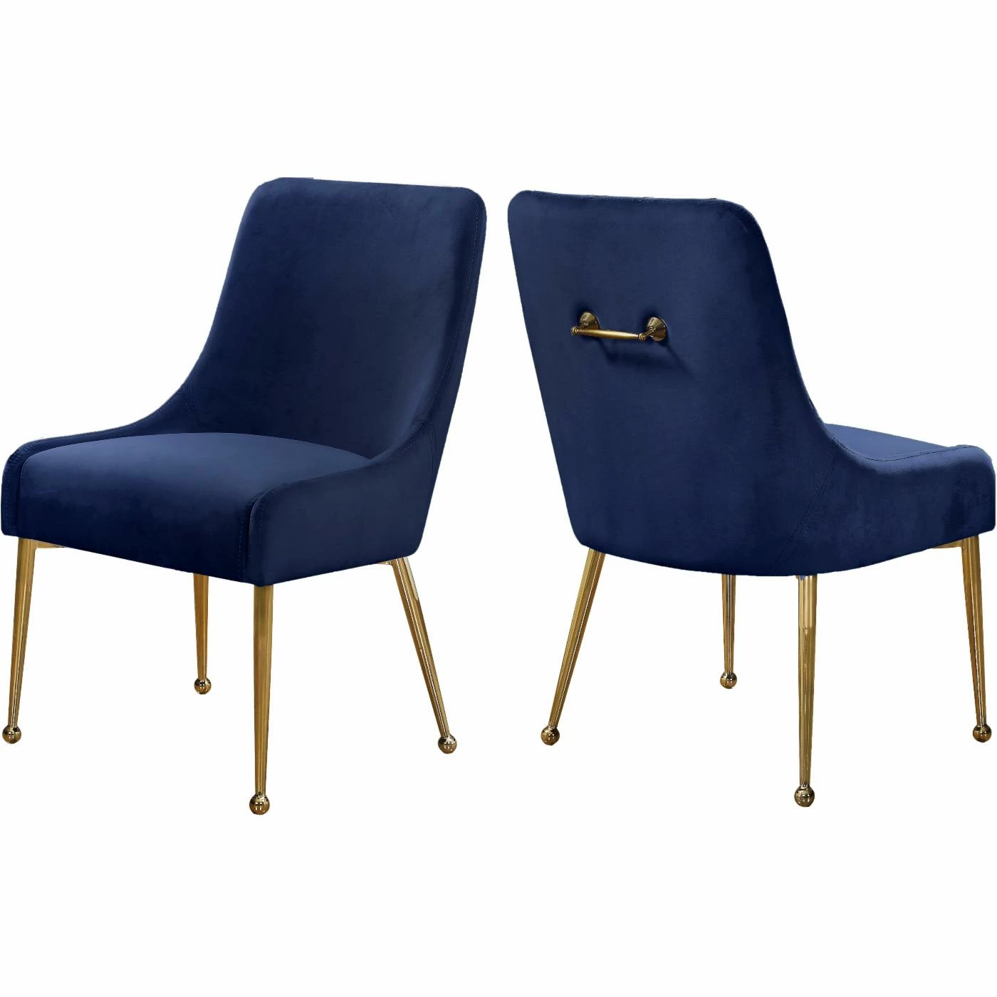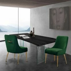 Invite bold modern style over to dine with the Meridian Furniture Inc Owen Upholstered Dining Side Chair – Set of 2. A classic design is angled for a contemporary update and dressed in your choice of available velvet upholstery color. The set includes two dining chairs with decorative gold-finished steel handles at the back. They sit on slim, tapering steel legs in gold.