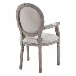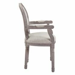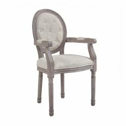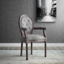 Dine in French country style with the Modway Arise Vintage French Upholstered Fabric Dining Armchair. Reminiscent of 18th century French design, this dining chair features button-tufted diamond trim, a fluted frame, and a weathered finish to create a vintage air. Its rubberwood frame and welted polyester upholstery comes in your choice of available color to complement any home. Dense foam padding on the seat cushion ensures your comfort, while the floor pads help protect your floor.