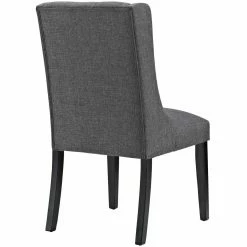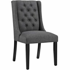 With its luxurious button tufting and sleek curves, the Modway Baronet Fabric Dining Side Chair will add a dignified look to your dining area. The dense foam padding will provide optimal comfort. The solid wood frame of this fetching dining chair is wrapped in soft polyester fabric that includes available color options. The angled legs are capped with non-marking foot glides to protect your floors.