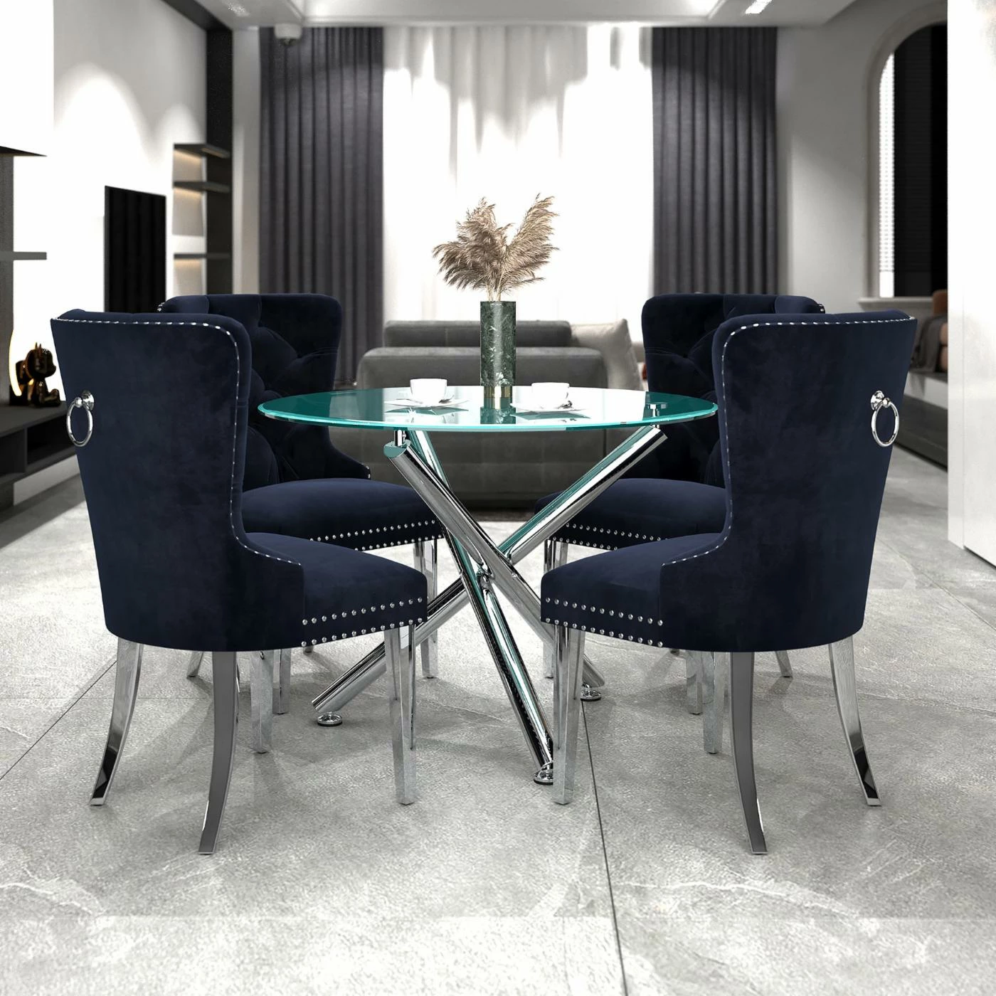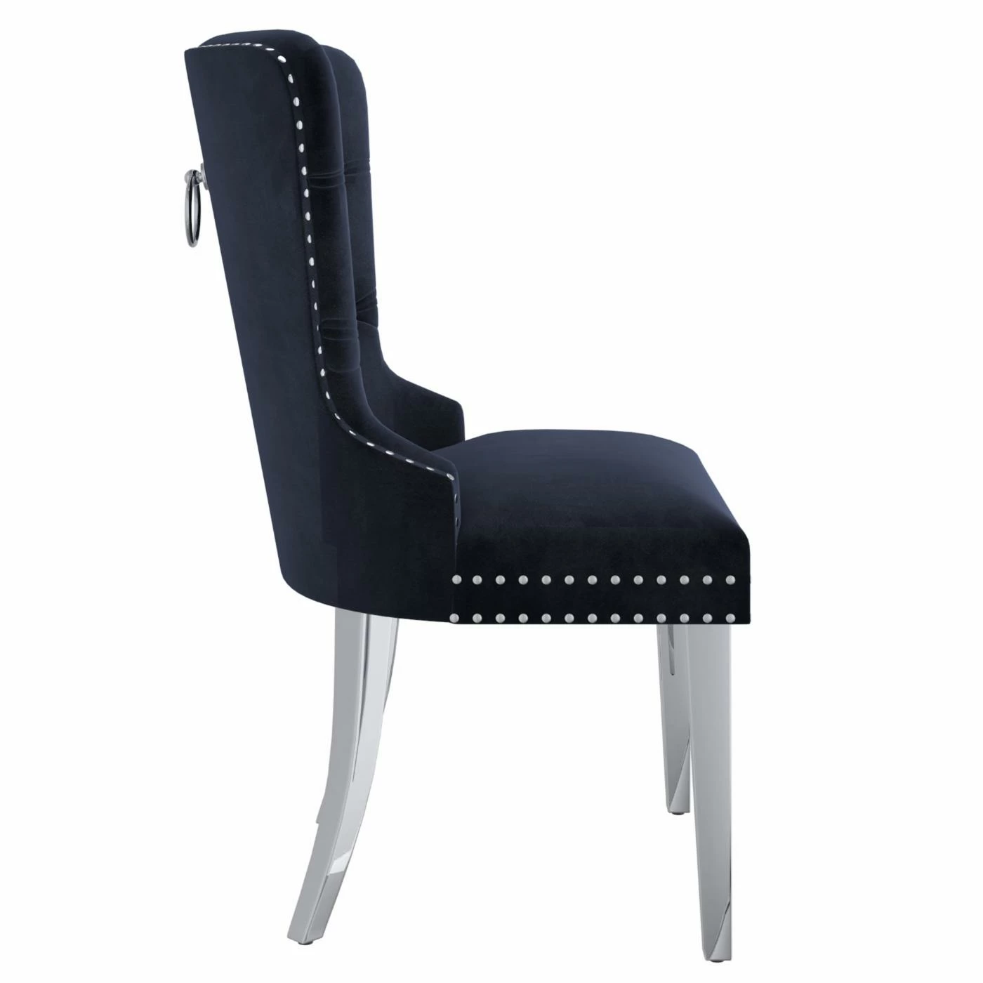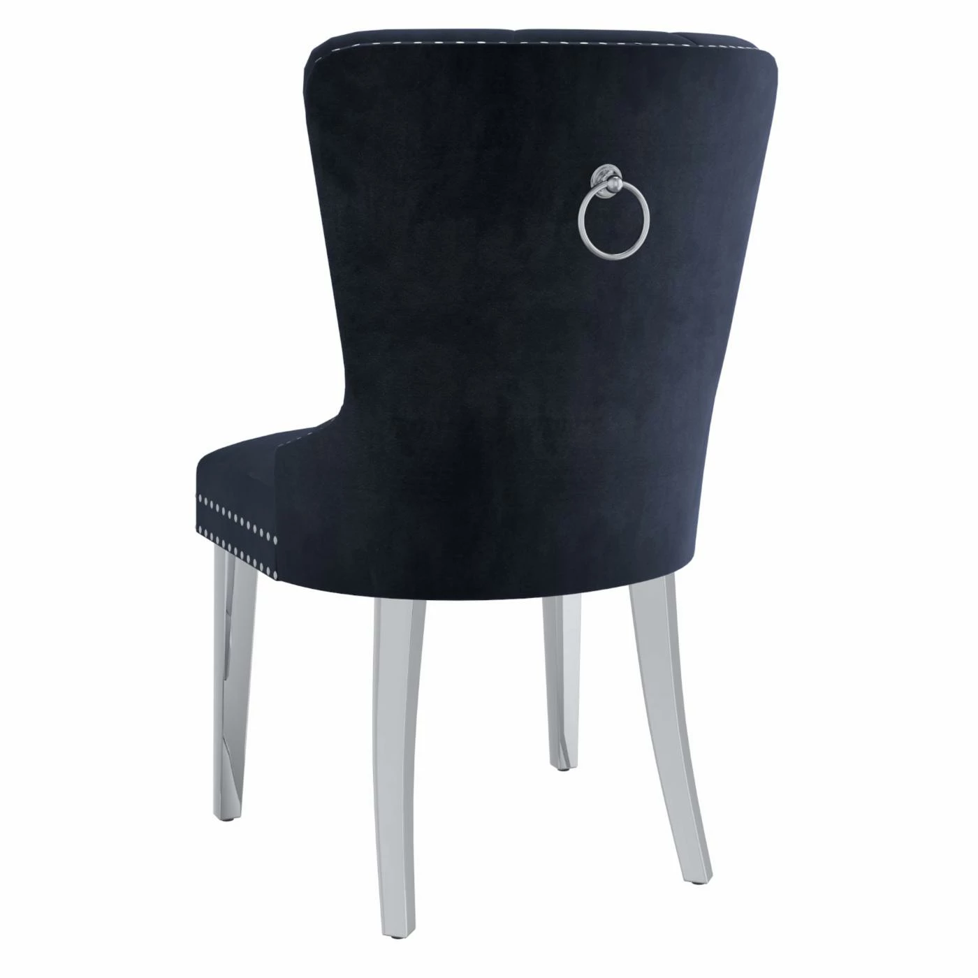 - Stainless steel legs in a chrome finish and chrome ring accent on back