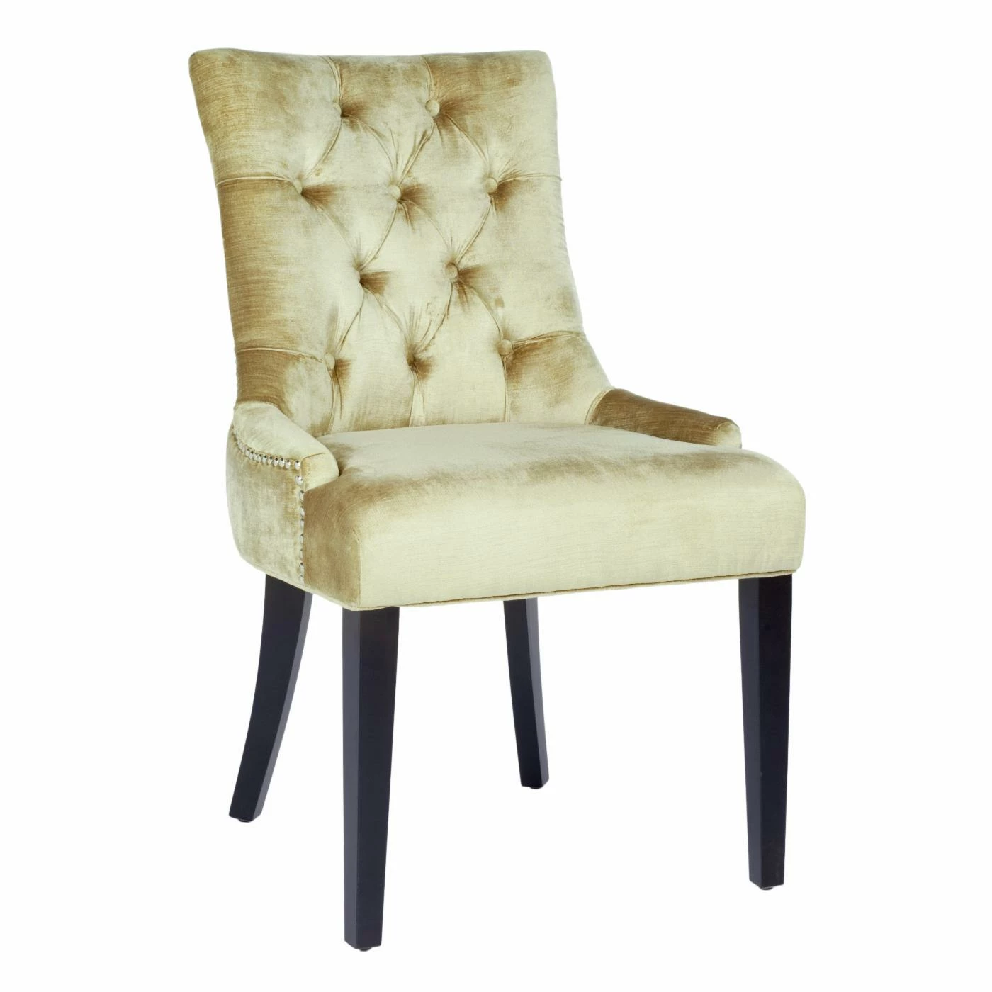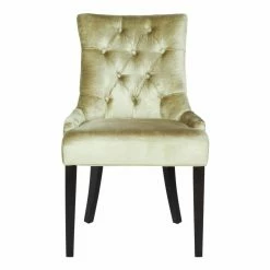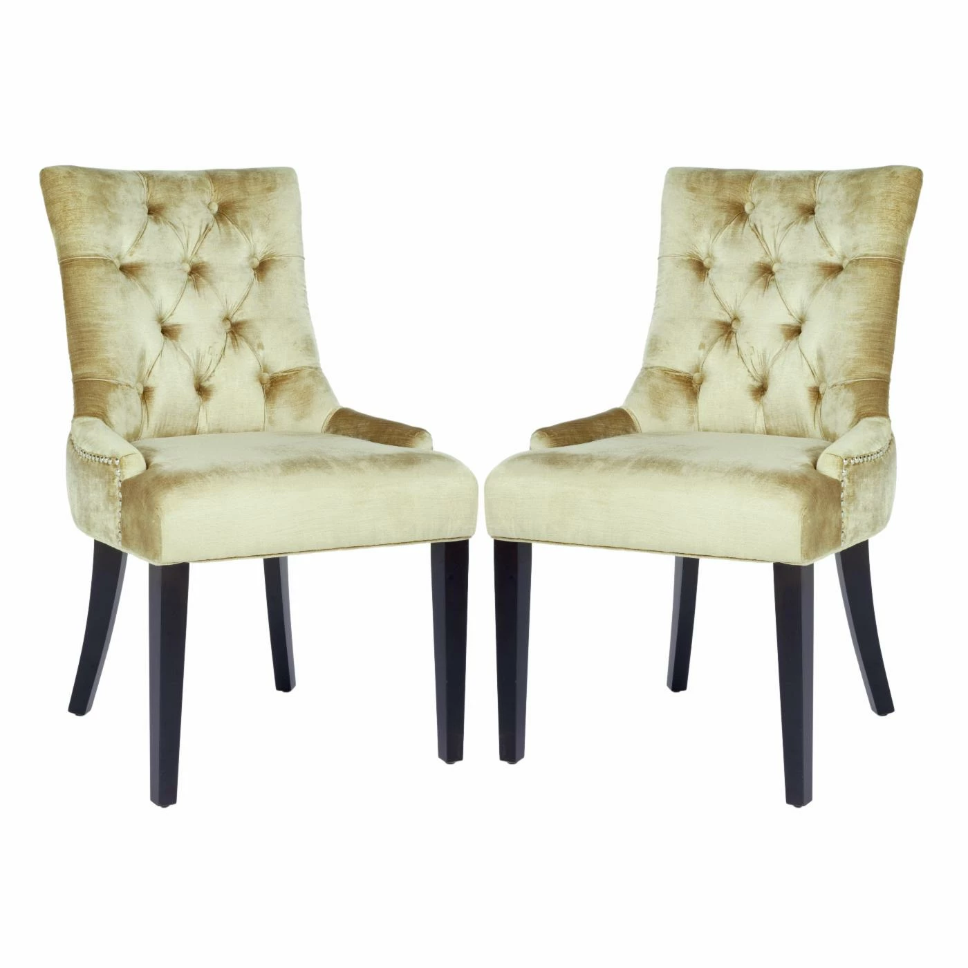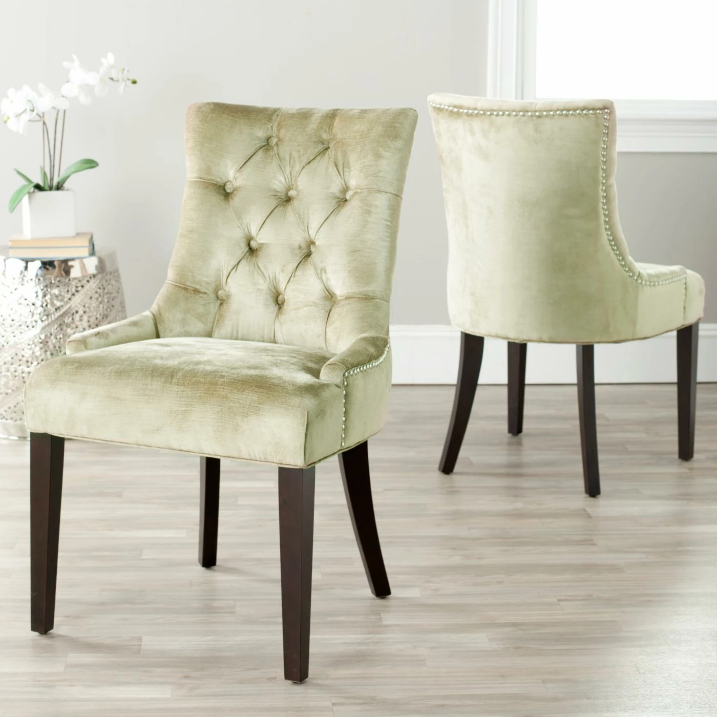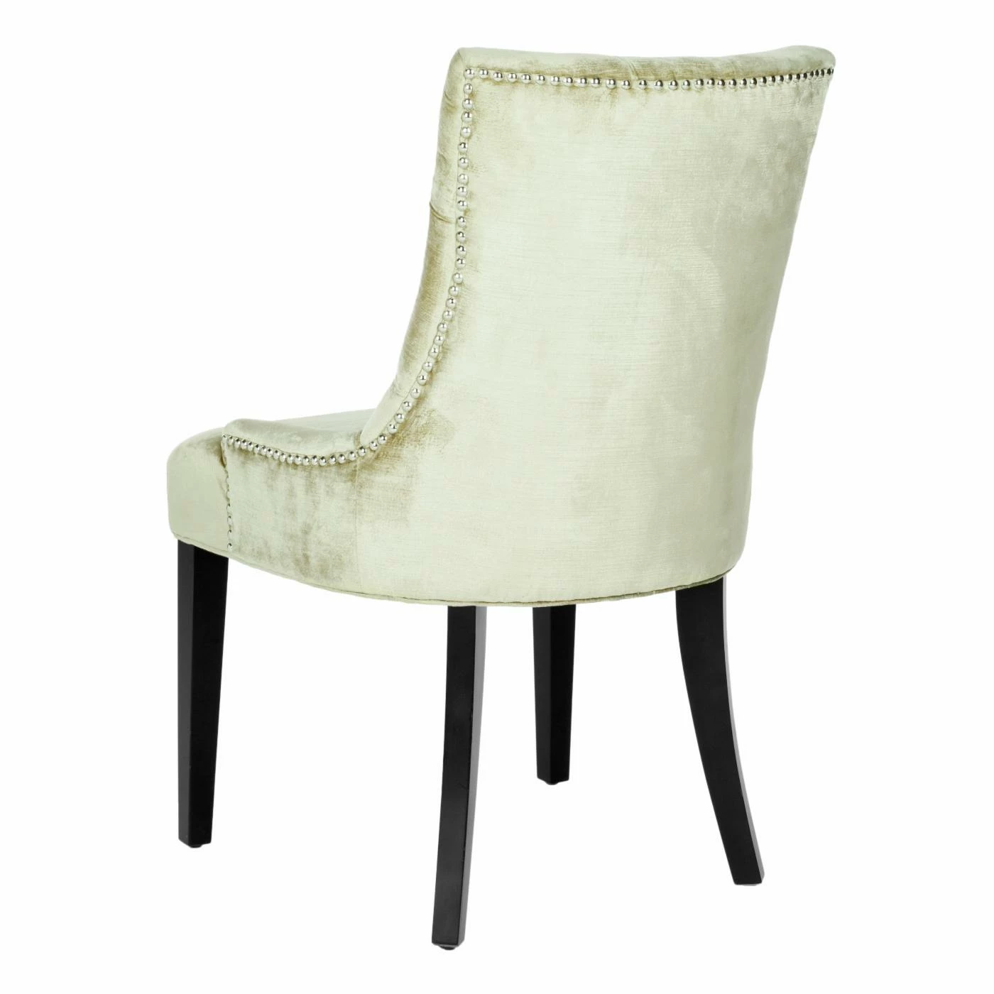 The Safavieh Ashley Dining Side Chairs – Set of 2 is a perfect match for any dining or living room dΓ©cor. Each chair features a button tufted solid birch wood top frame and legs. Its luxurious antique sage crushed velvet upholstery and individual nickel nail trim wraps around this chair and is finished off with espresso stained legs. To make it more comfortable for you and your guest it has a concave curved back. Comes as a set of two.