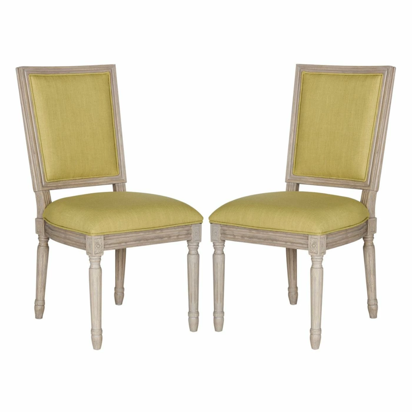 Invite traditional French-inspired style to your table with the Safavieh Buchanan Linen Side Dining Chair – Set of 2. Old World elegance abounds on this dining chair, which features a sturdy rubberwood frame in a rustic gray finish. Distressed effects pair perfectly with the carved details throughout, and both the seat and back are upholstered in linen fabric in a choice of available color. Packaged as a set of two.