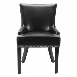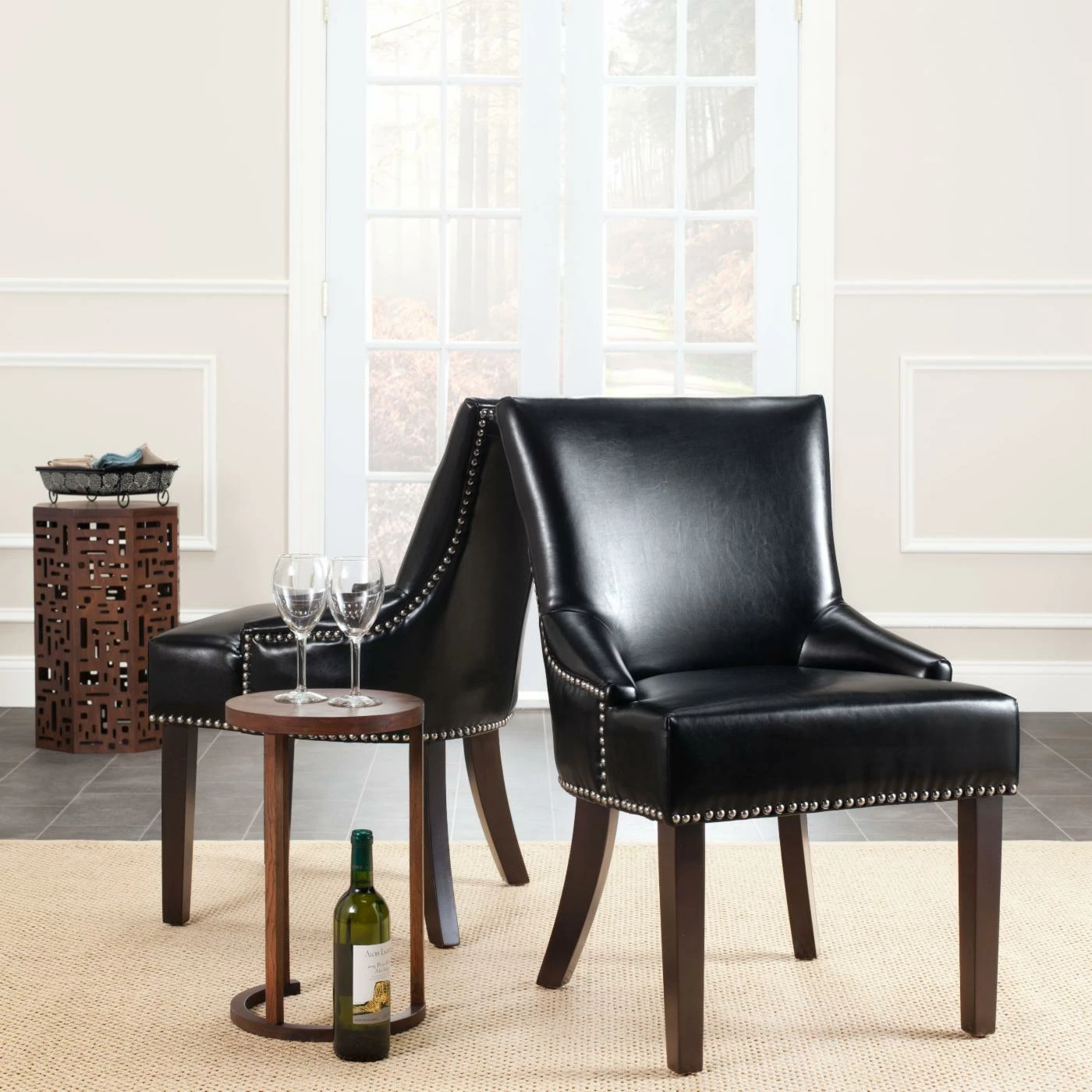 A wonderful accent piece for your home, the Safavieh Gavin Dining Side Chairs – Black – Set of 2 offers a versatile look that is sure to fit into any decor. Crafted of durable birch wood, this set of two stands on legs that are finished in a rich espresso and is upholstered in smooth black bicast leather. What sets these chairs apart are the dazzling nail head detailing along the base of each chair.