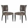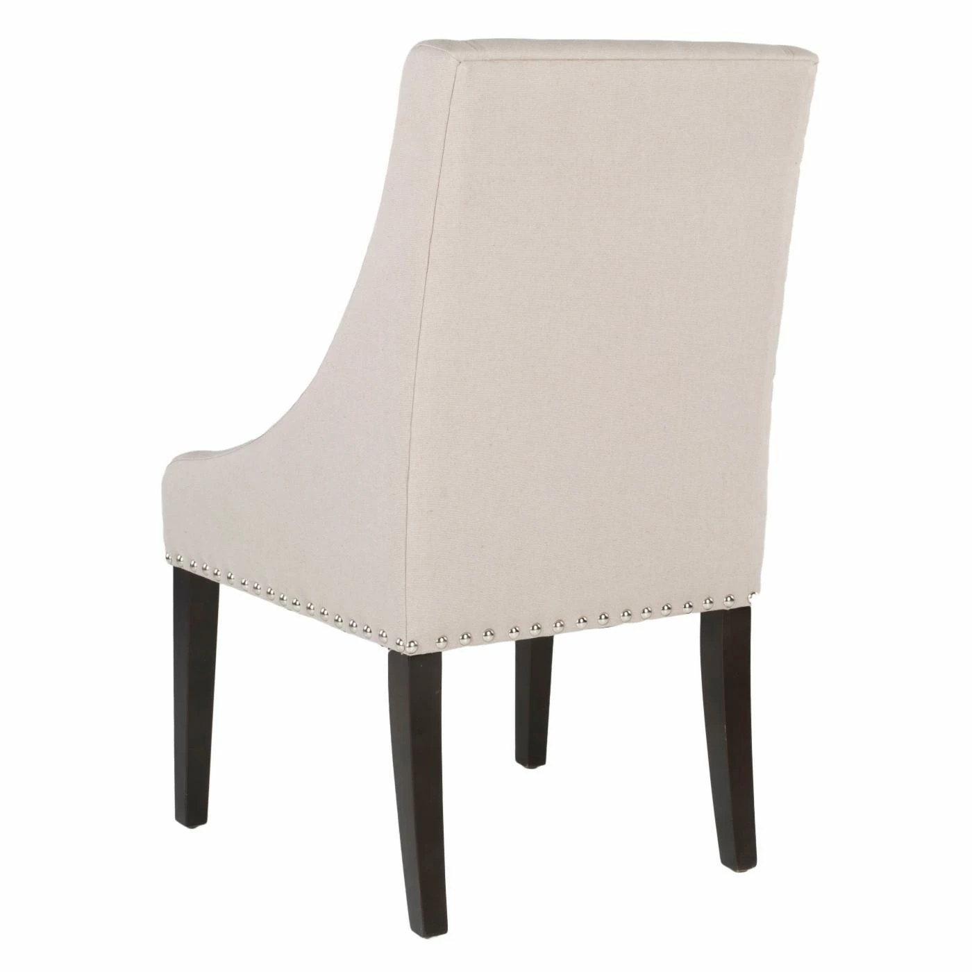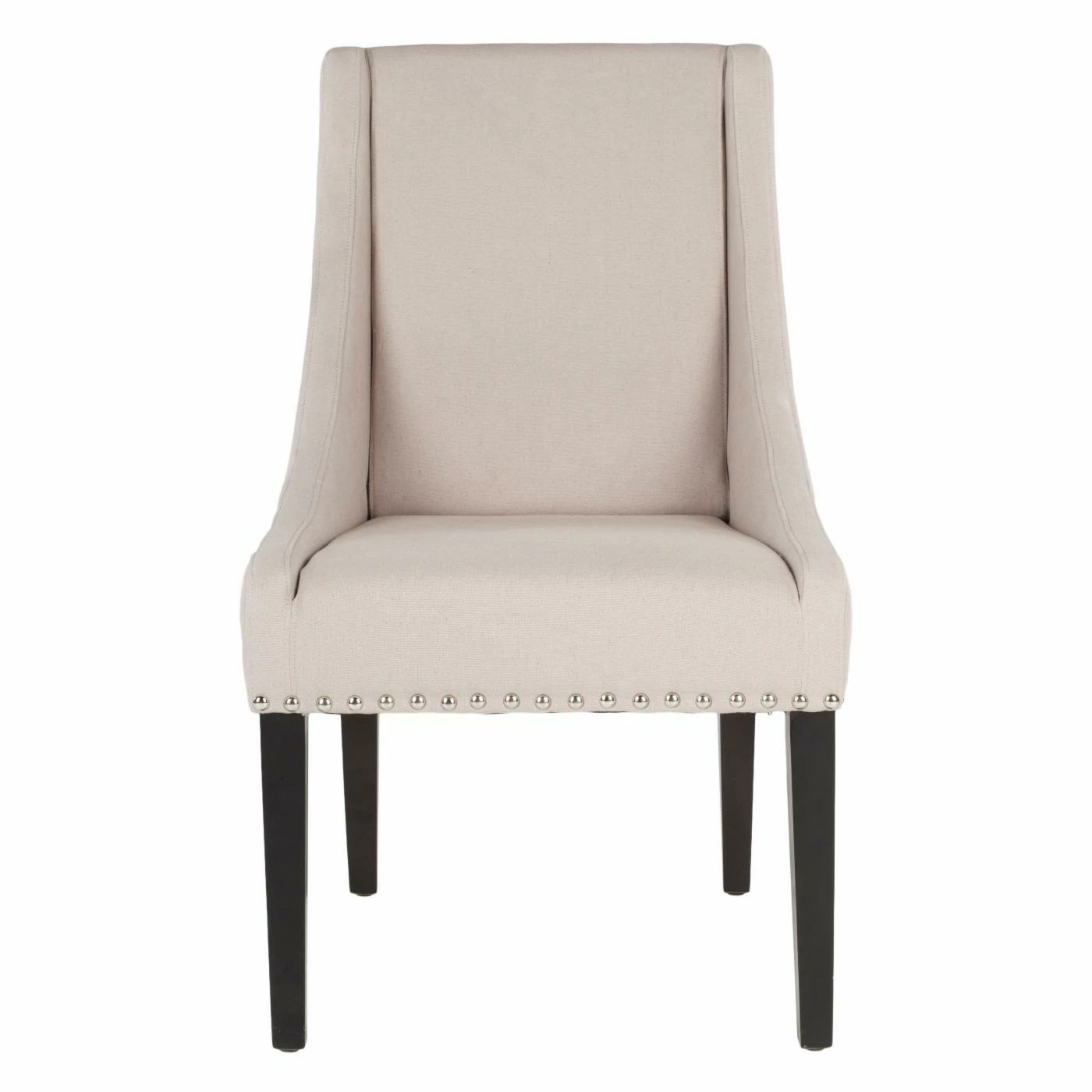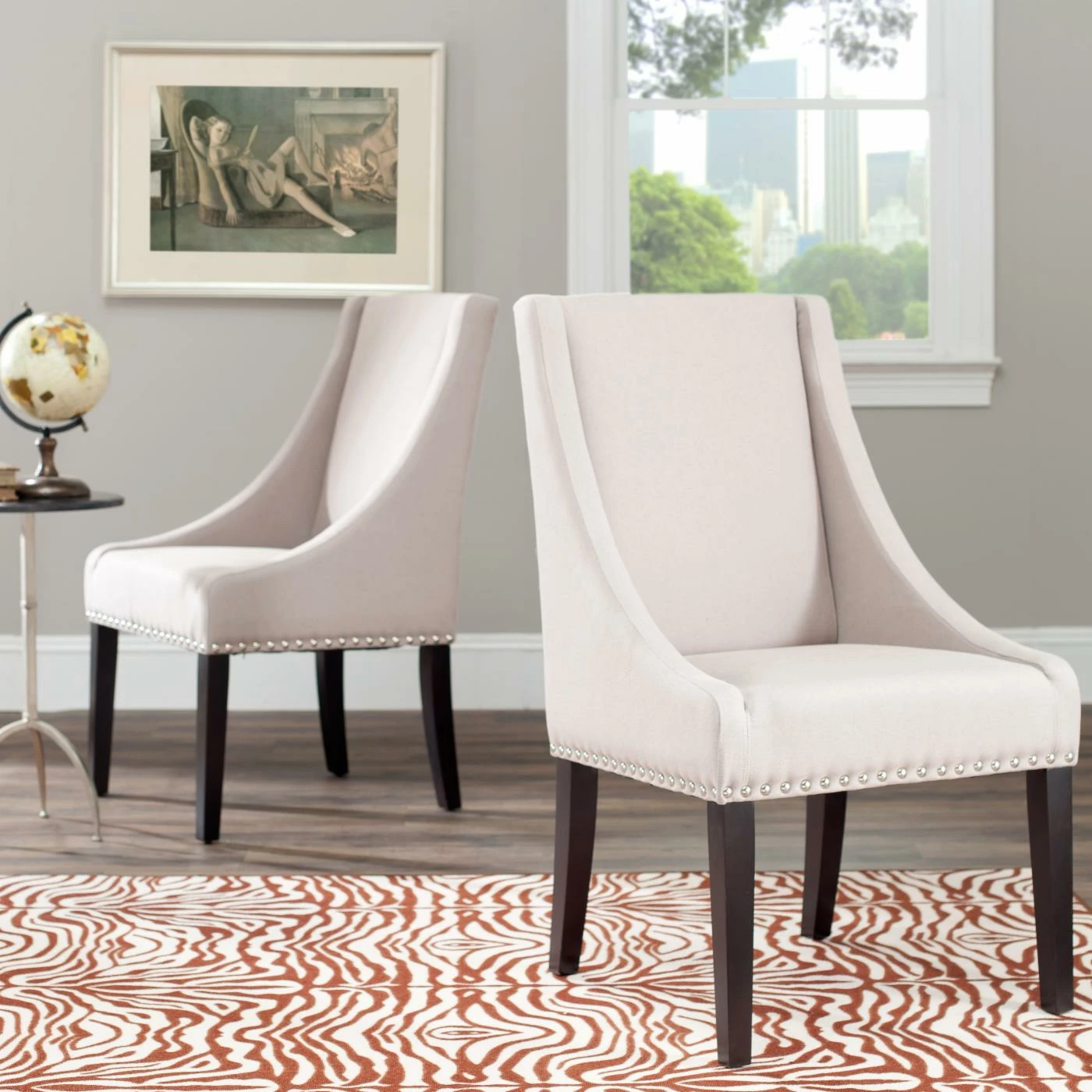 The Safavieh Jordan Beige Dining Side Chairs – Set of 2 features a very comfortable and classic mid-century design. Each chair features a solid birch wood top, frame, and legs. This chic piece of furniture showcases charming beige linen upholstery, individual nickel nail trim that wraps around its base, and is finished off with espresso stained legs. A deep seat and concave curved back makes this one of the most comfortable chairs available.